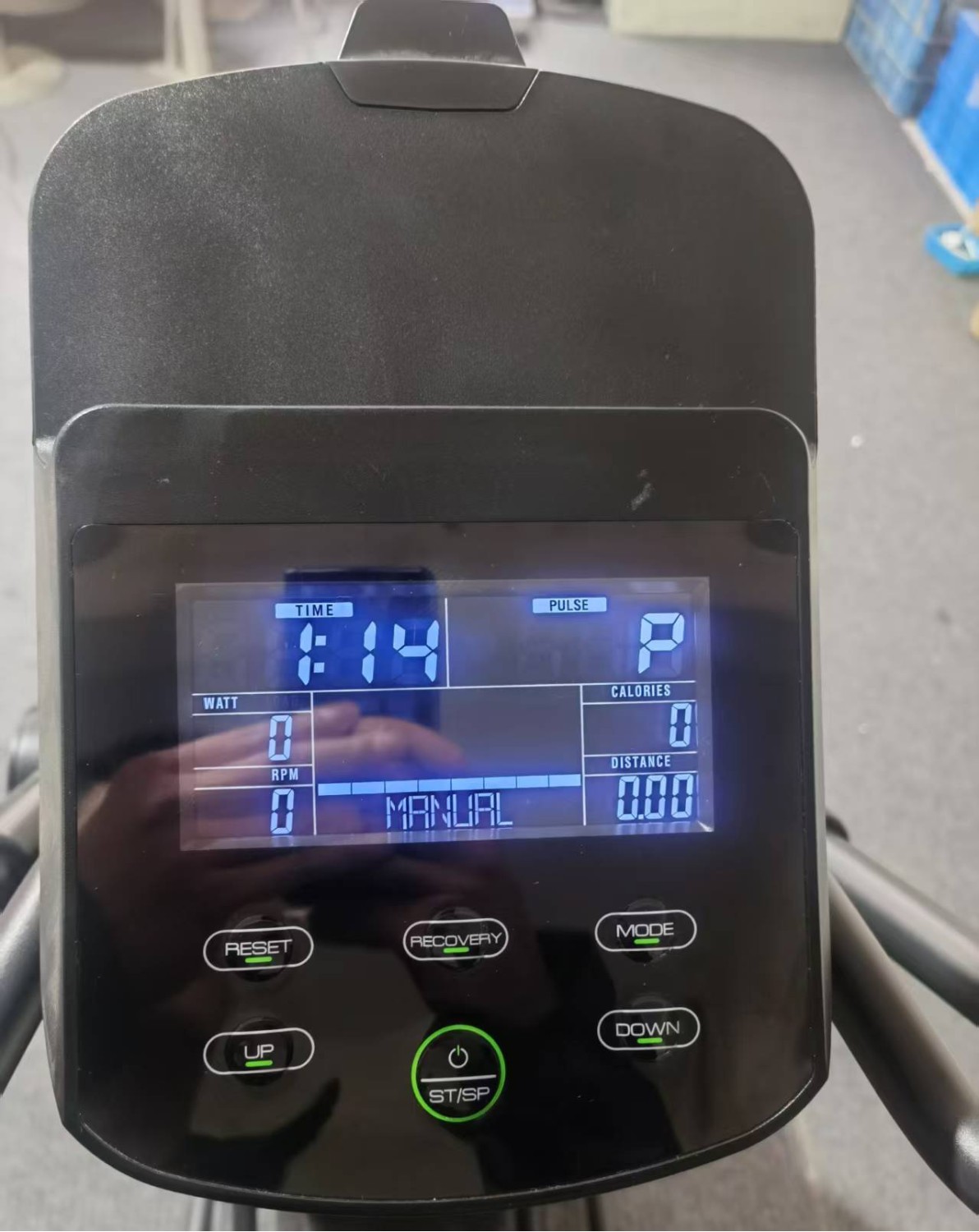 - Параметры отображаемые на дисплее: диаграмма текущей программы, время тренировки, дистанция, скорость, об/мин, калории, пульс, Вт.