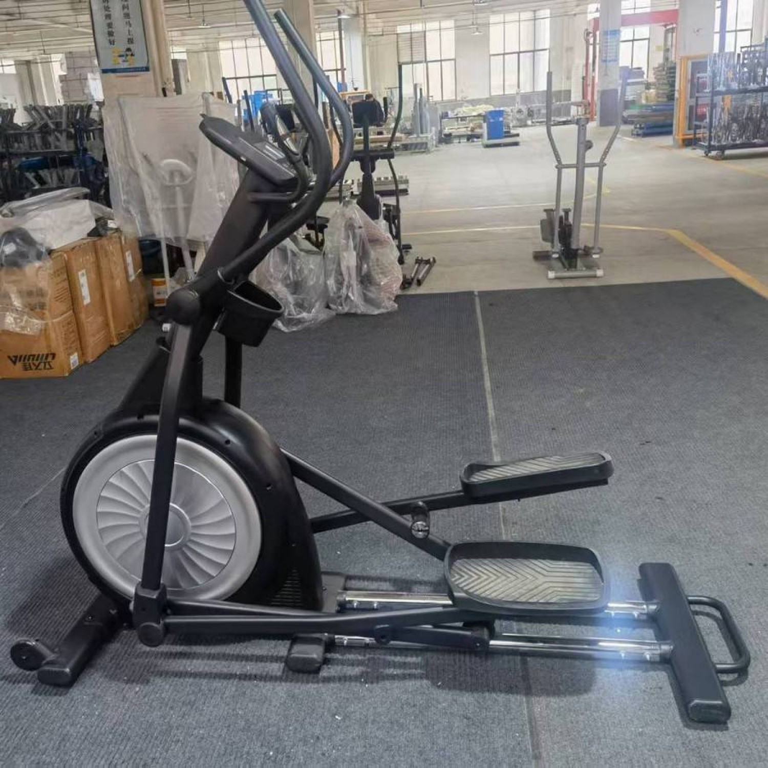 - Рукоятка на заднем стабилизаторе и транспортировочные колесики на переднем: для перемещения по залу, 6 прорезиненных ножек с регулировкой по уровню пола.