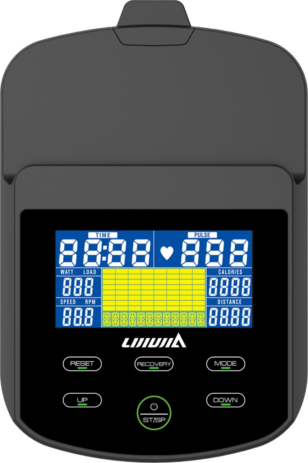 - LСD-дисплей с подсветкой и клавишами для изменения нагрузки и режима тренировки.