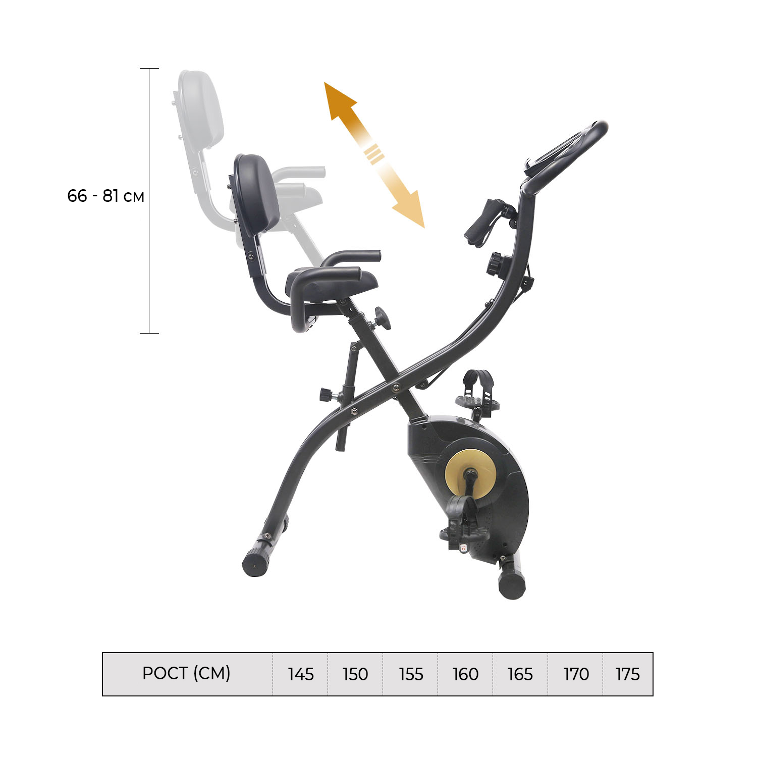 Широкое сиденье с поручнями и спинкой регулируется по высоте на 7 уровней в диапазоне от 66 до 81 см. Данное свойство позволяет заниматься пользователям ростом от 145 до 175 см. Максимально доступный вес пользователя - до 110 кг.