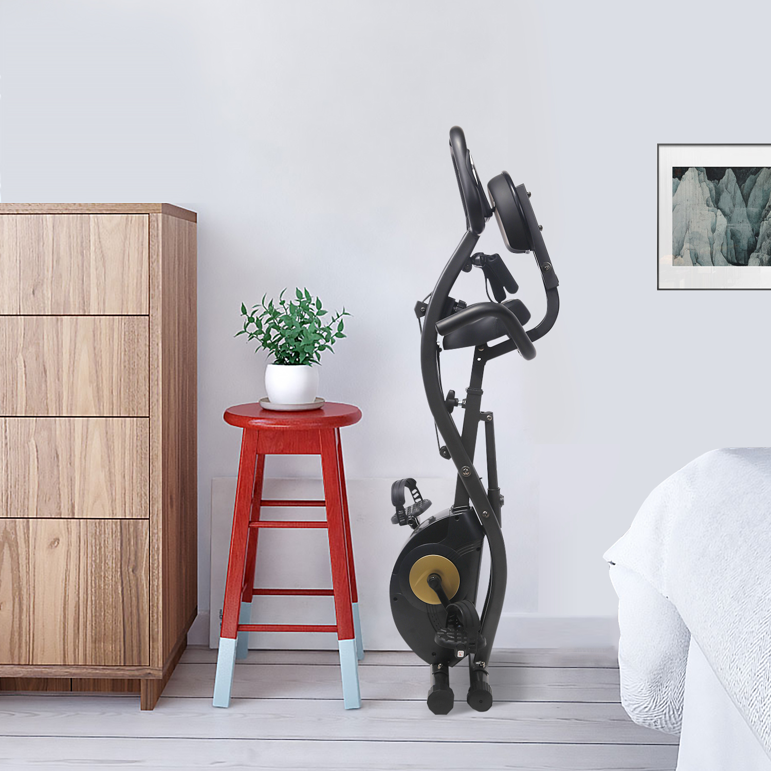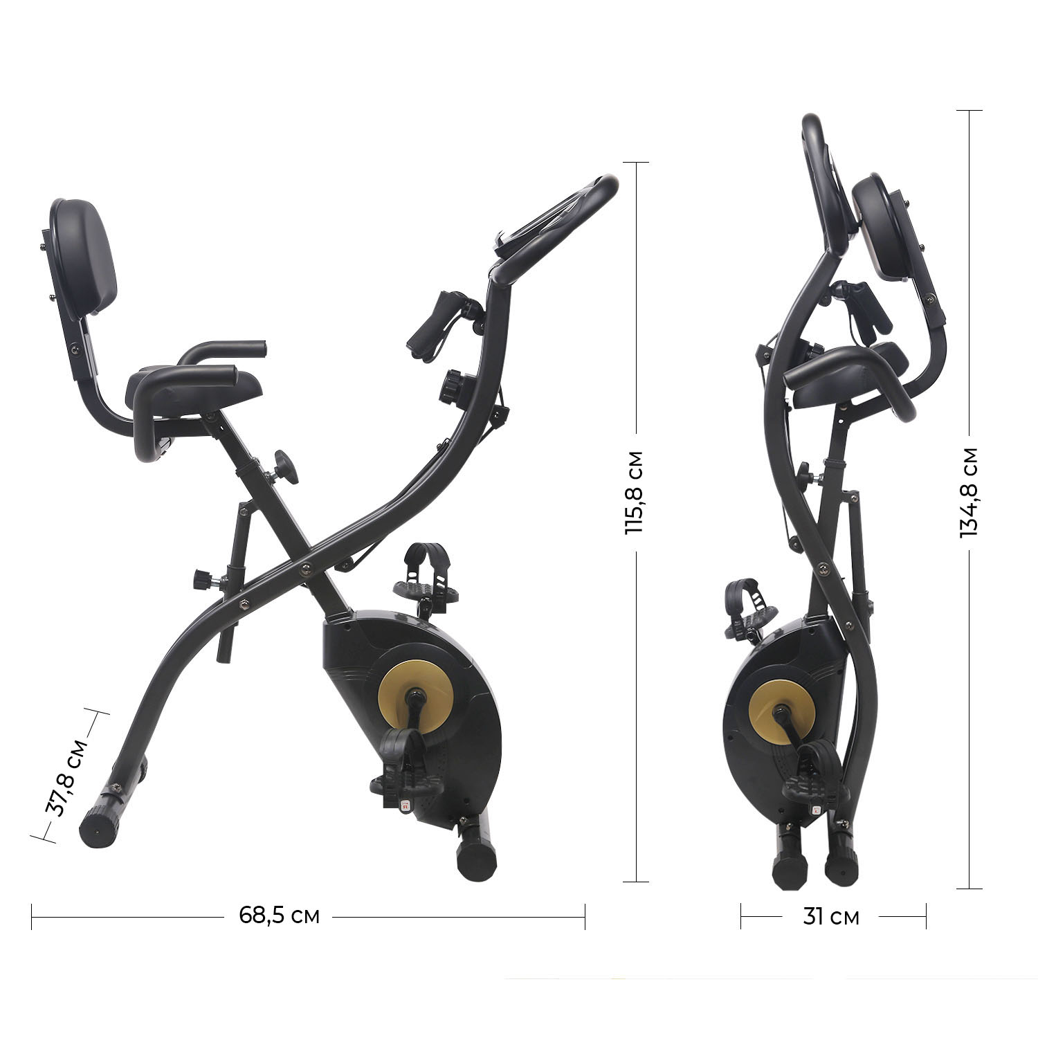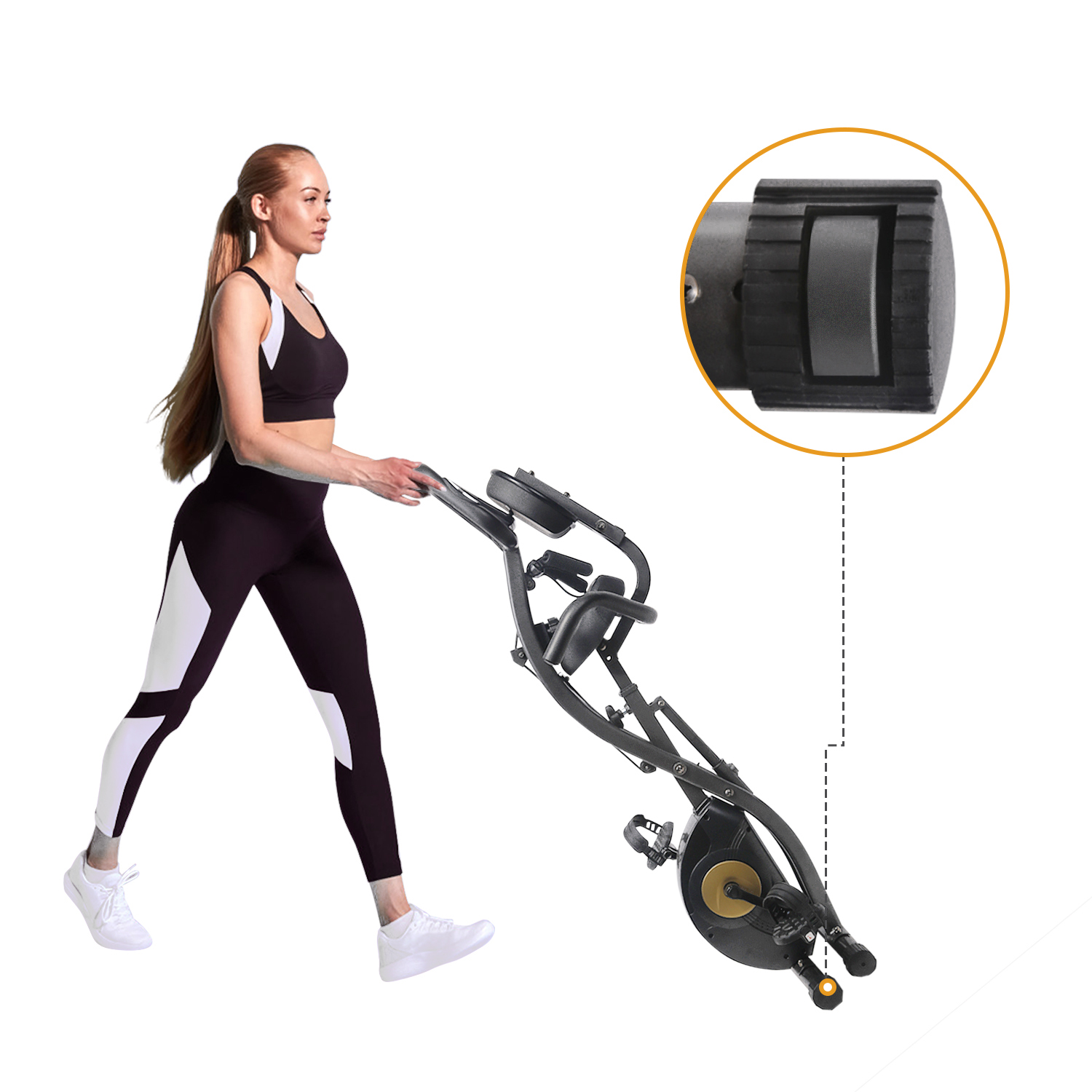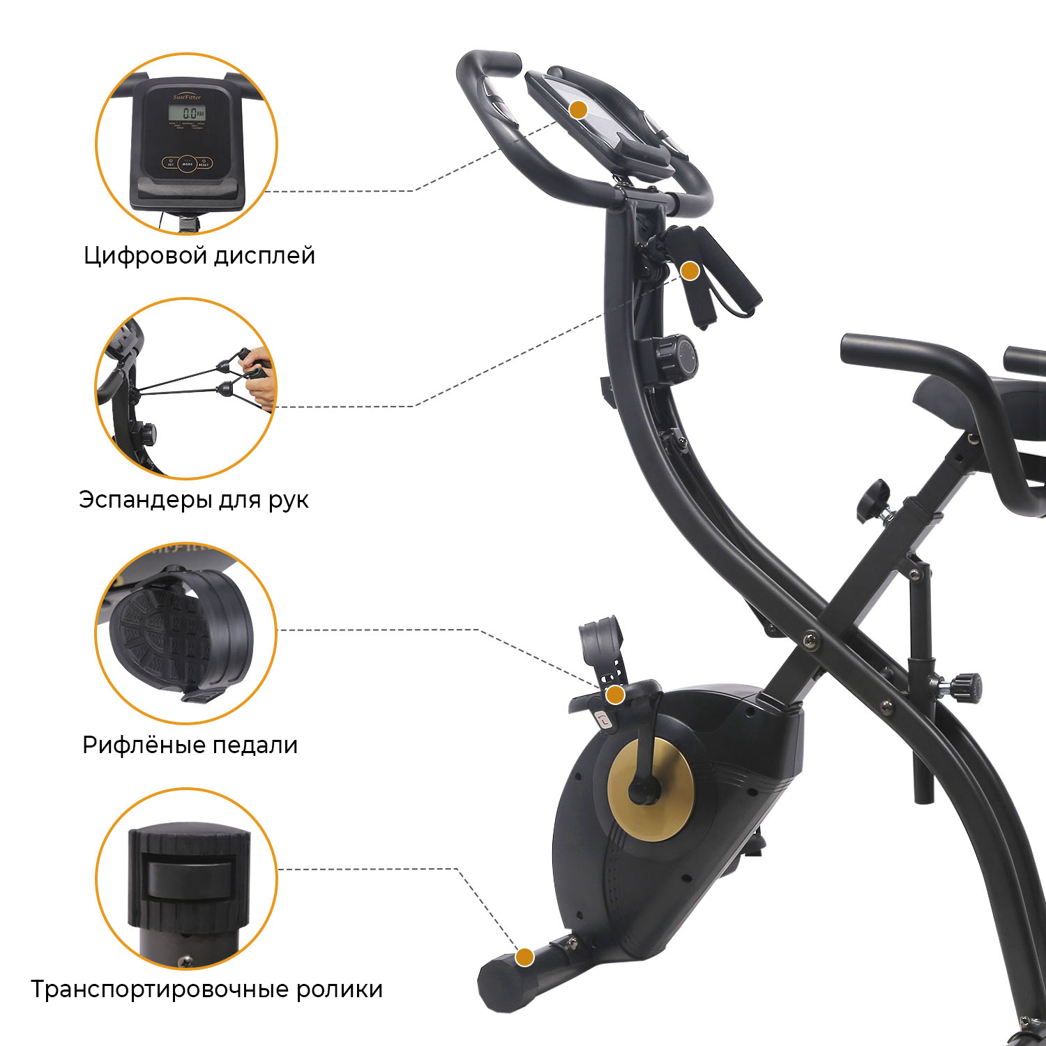 Отличительной чертой SUN FITTER PRO является складная конструкция: в сложенном виде тренажёр занимает всего 31 см по длине. Транспортировочные ролики на передних ножках предусмотрены для лёгкого перемещения по дому. Компенсаторы неровности пола на задних ножках велотренажёра обеспечат комфортные тренировки в любом помещении.