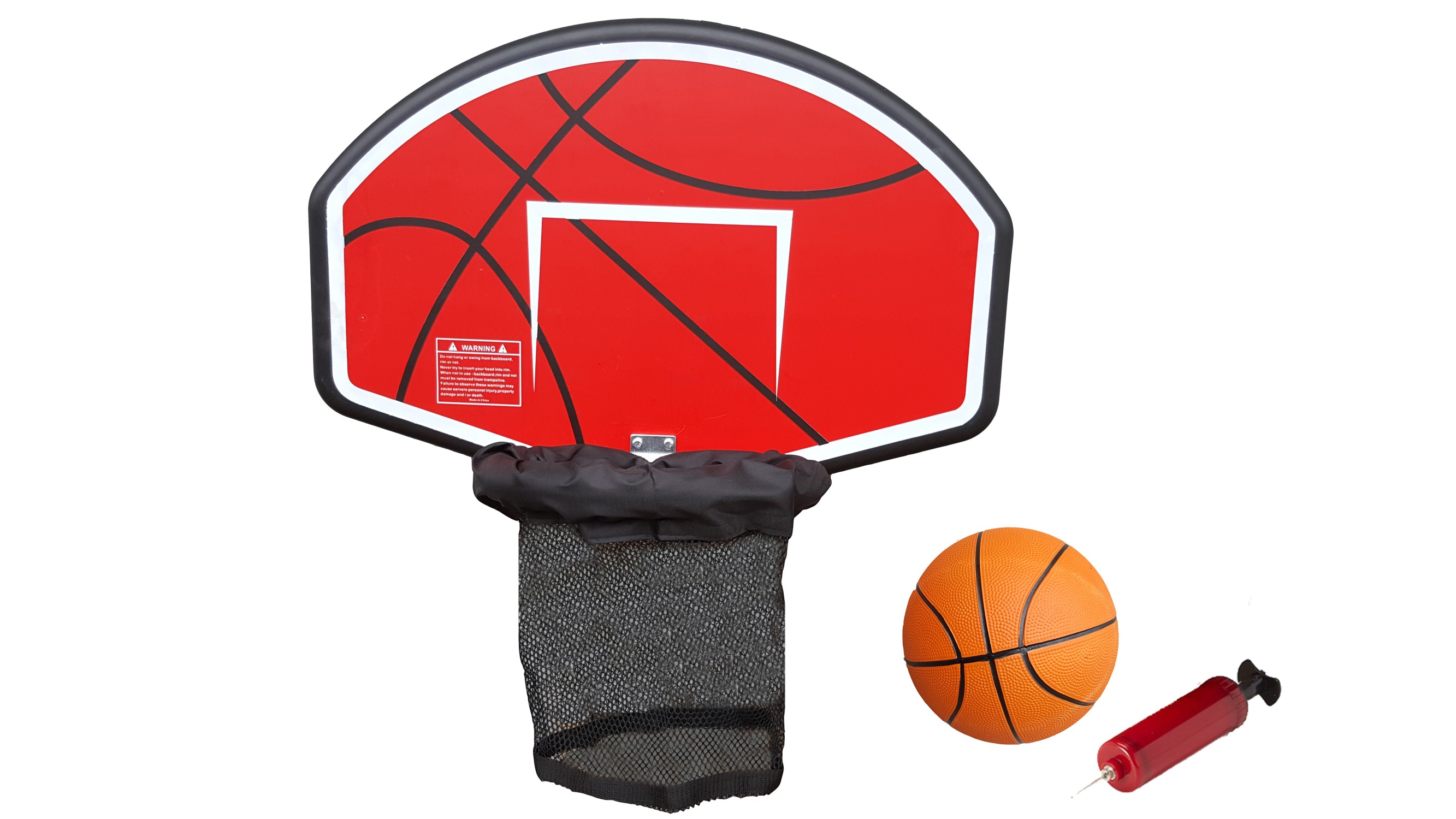 Комплект состоит из: щита, кольца, сетки, мяча, насоса и комплекта креплений к батуту.