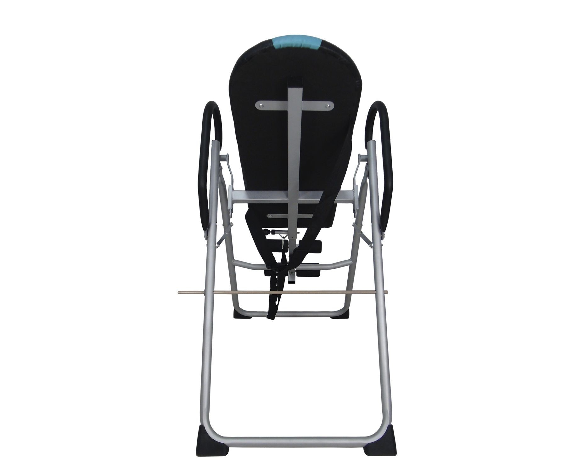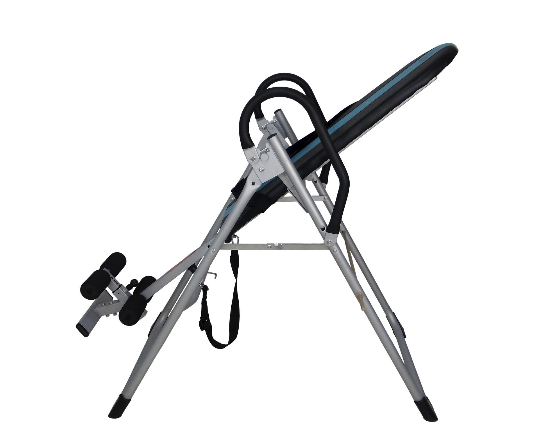 Инверсионный стол складной для домашнего использования с удобной мягкой спинкой. Цвет спинки чёрный с яркой голубой вставкой. Фиксатором для ног являются мягкие валики, регулируемые по длине.