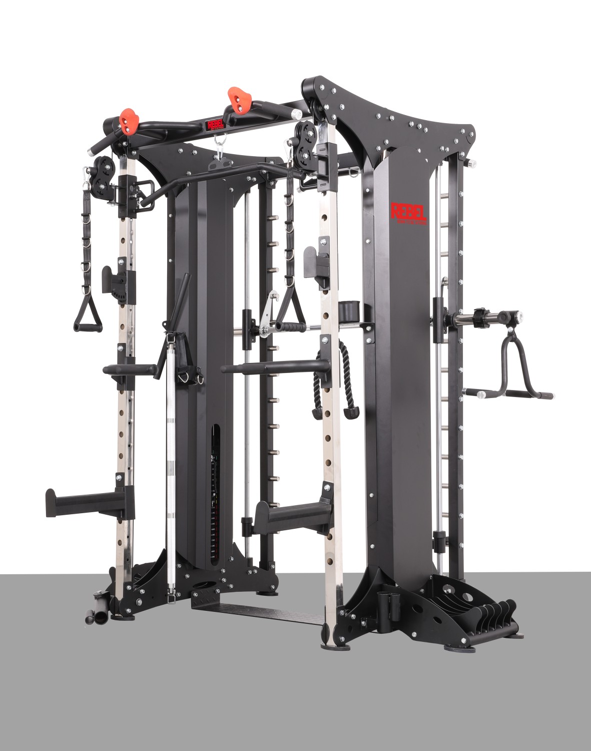На силовой раме тренировочного комплекса REBEL RDT803-90 расположены две пары перемещаемых по высоте страховочных захватов разной длины для работы с независимым грифом.
