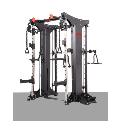Машина Смита мультикомплекса имеет встроенный несъемный гриф со страховочными захватами, перемещающийся в вертикальной плоскости на линейных подшипниках по цельнометаллическим каленым направляющим. Количество положений фиксации грифа в вертикальной плоскости – 12.