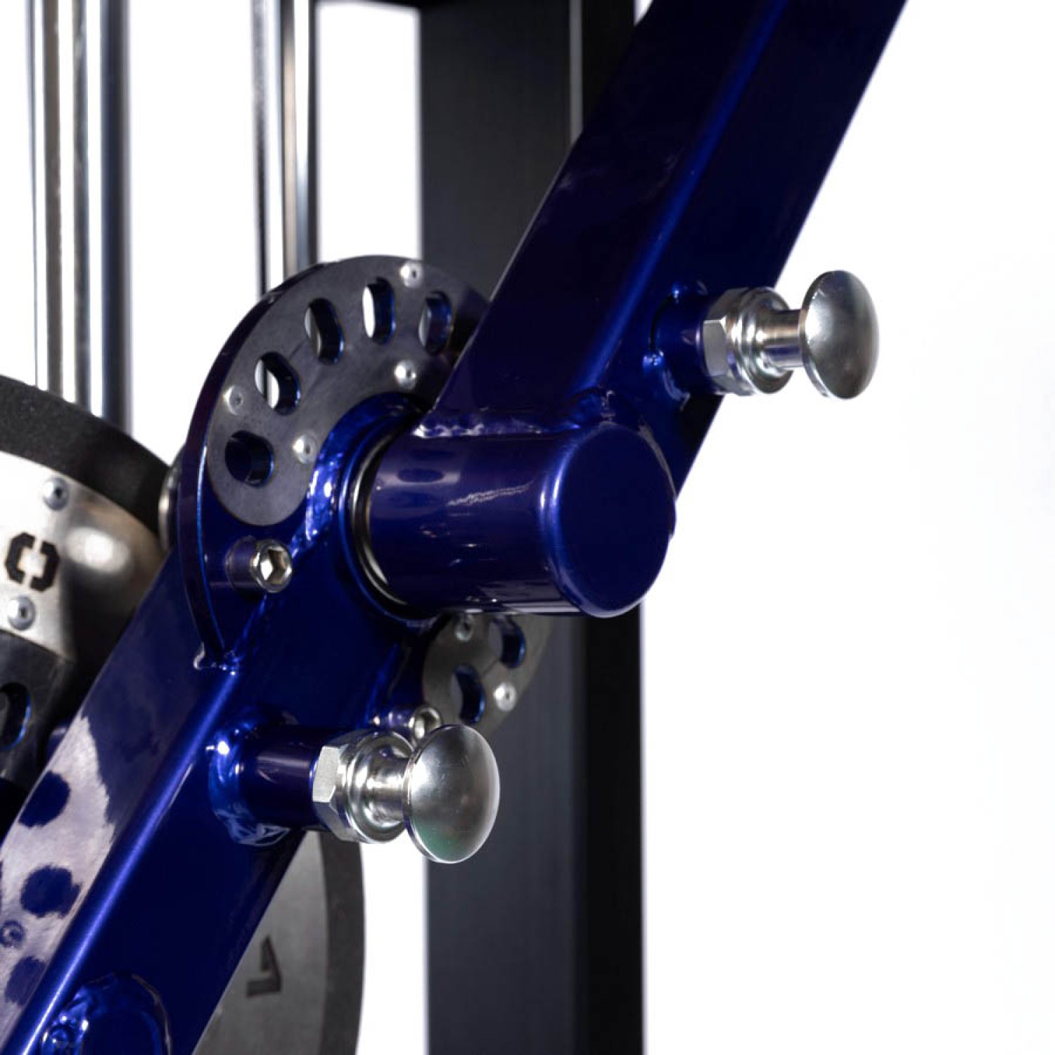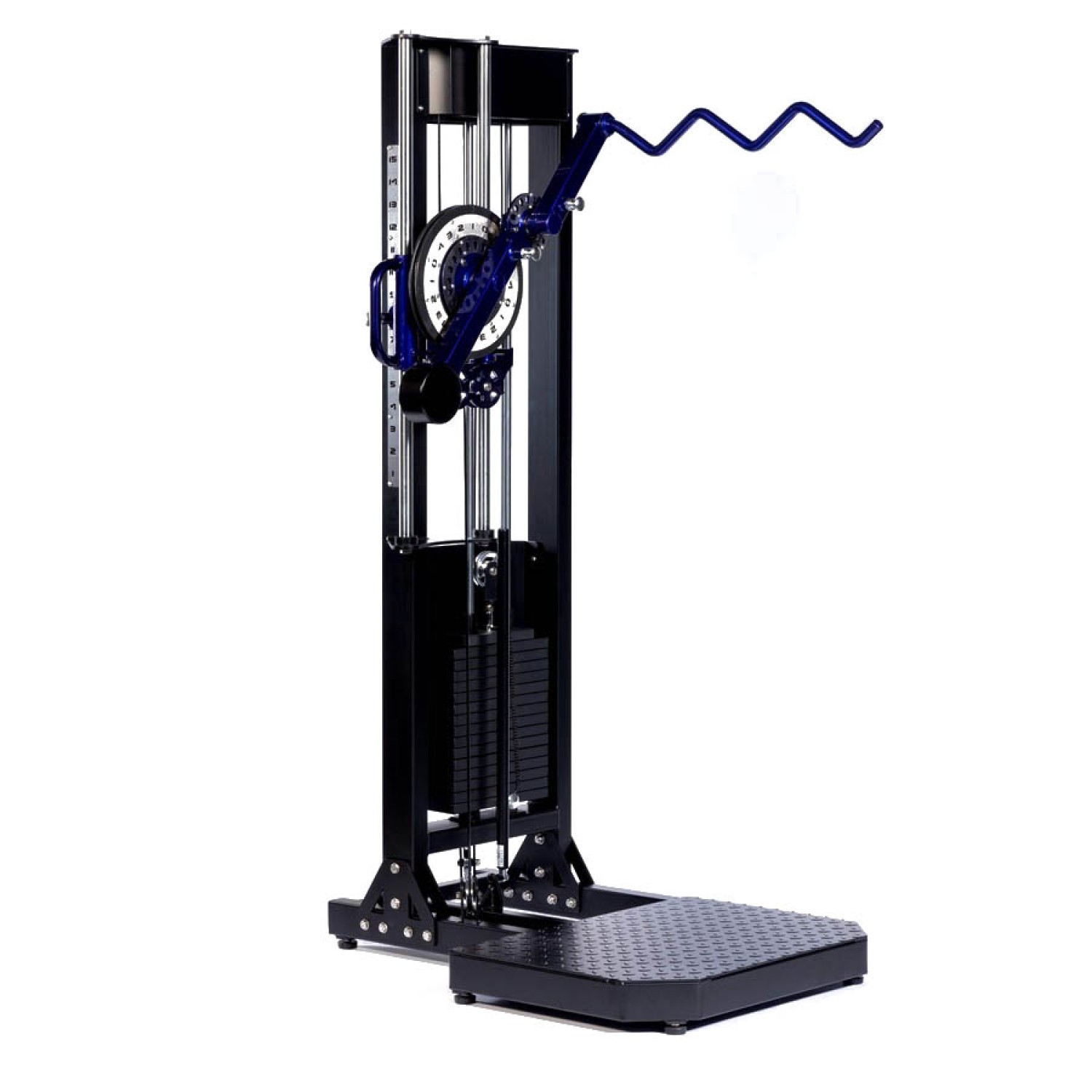 На стальную рукоятку нанесена накатка для прочного хвата, сама рукоятка также имеет регулировку угла. Мультипозиционная ручка дает возможность акцентировать усилие на разных мышечных группах рук с помощью прямого и обратного хвата разной ширины. Противовес с защитным антикор покрытием облегчает стартовое усилие и делает движения более плавными и безопасными для связок и мышц спортсмена. Широкие плиты стека и направляющие из полированной стали, а также мягкий и прочный 6 мм трос в нейлоновой оболочке исключают рывки и неравномерность нагруки во время упражнений.
