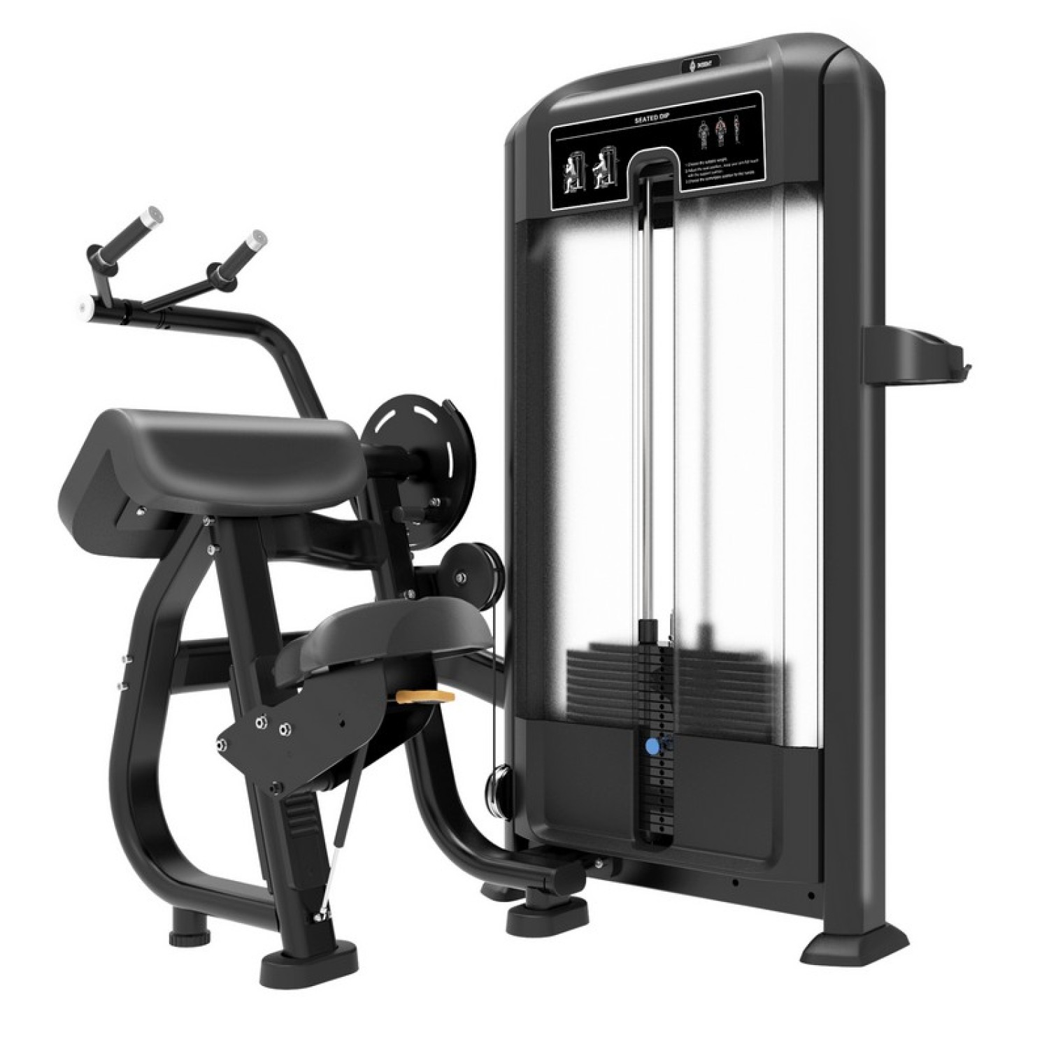 Контурная удобная подушка для локтей с наклоном в 45 градусов позволяет правильно и эффективно изолировать мышцы рук во время тренировки. Сиденье трицепс-машины регулируется под разный рост пользователя в 13 позициях. Механизм регулировки сиденья: возвратный, на газовом амортизаторе, с большой удобной рукояткой позволяет менять позицию не вставая с тренажера. Контурное эргономичное сиденье из прочной ПУ кожи профессионального класса с наполнителем из цельного ППУ уменьшает давление на поясничный отдел и позволяет занять удобное положение во время тренировки.
