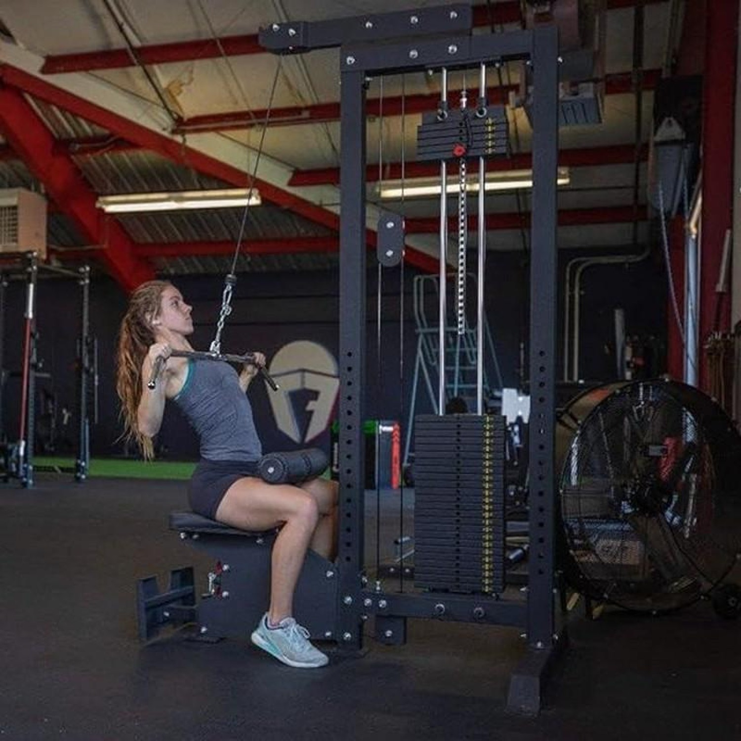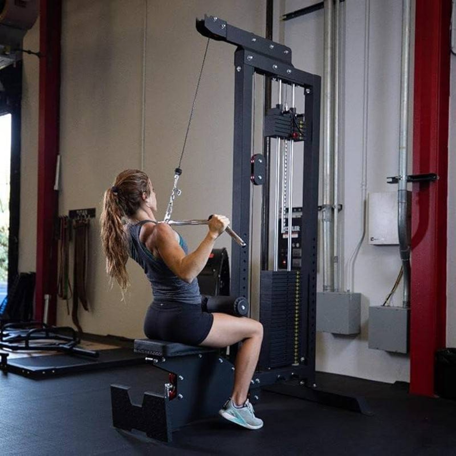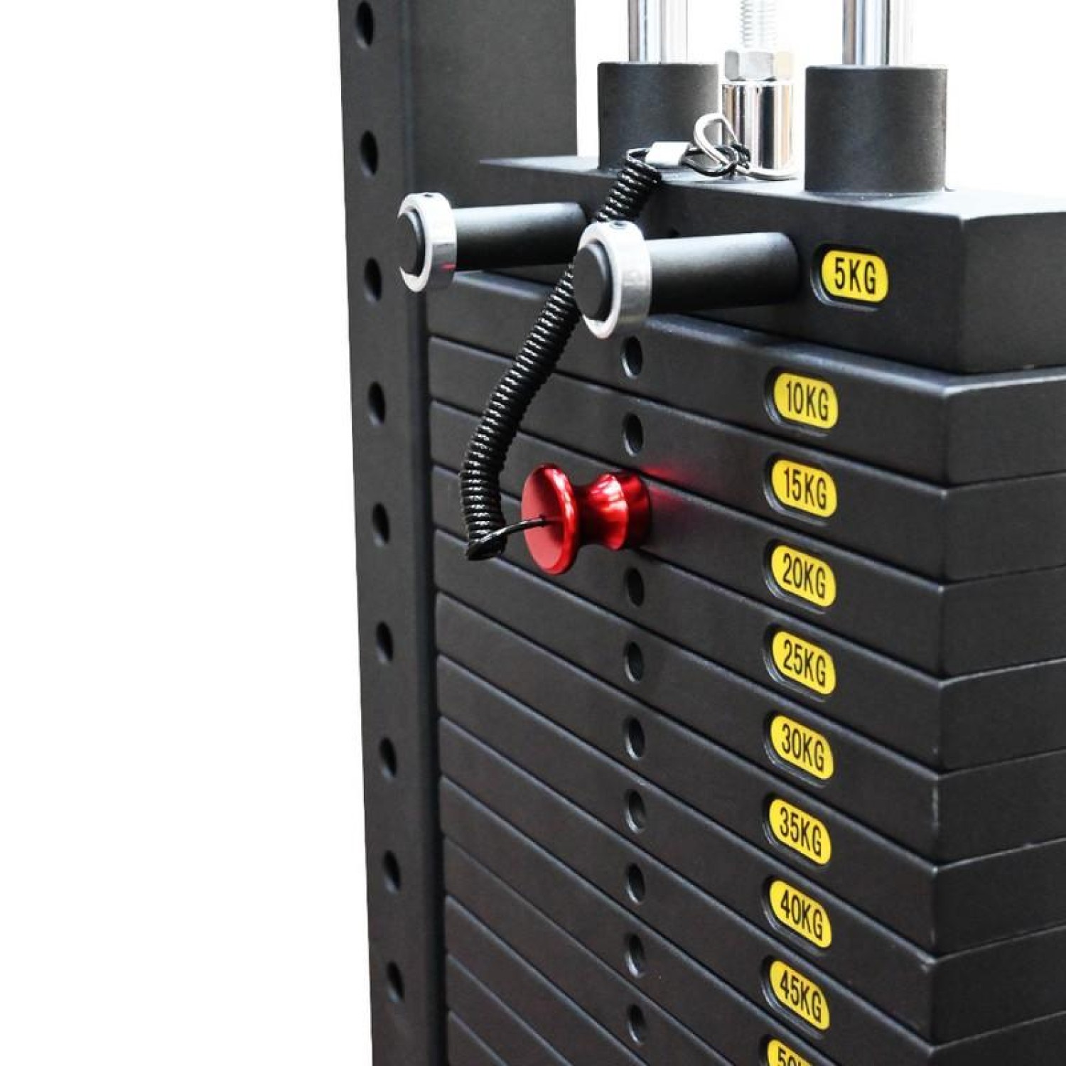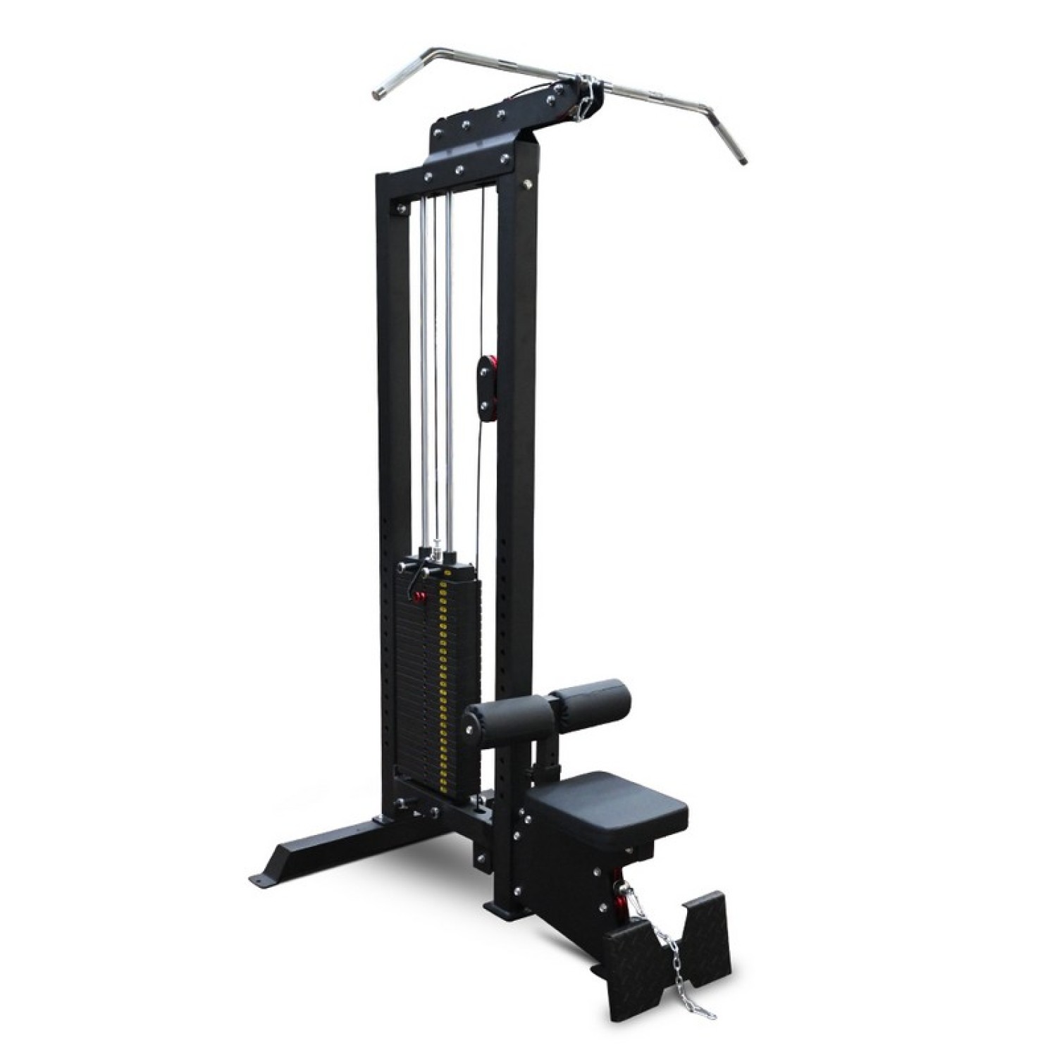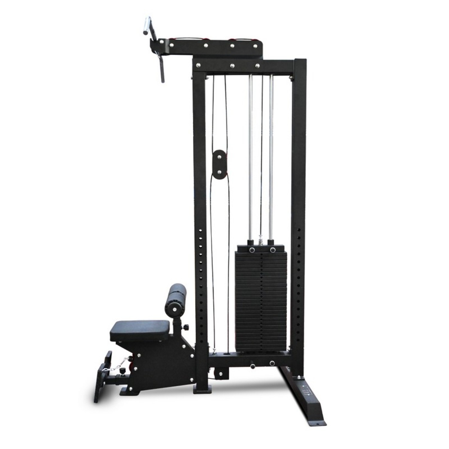Тренажер для верхней и нижней тяги имеет компактный дизайн с перпендикулярным расположением стека. Грузоблок имеет открытую конструкцию, без кожуха, что позволяет легче обслуживать тренажер и следить за его подвижными узлами. Смена веса происходит с помощью удобного штыревого фиксатора с подмагниченной ярко-красной алюминиевой ручкой и стальным сердечником.