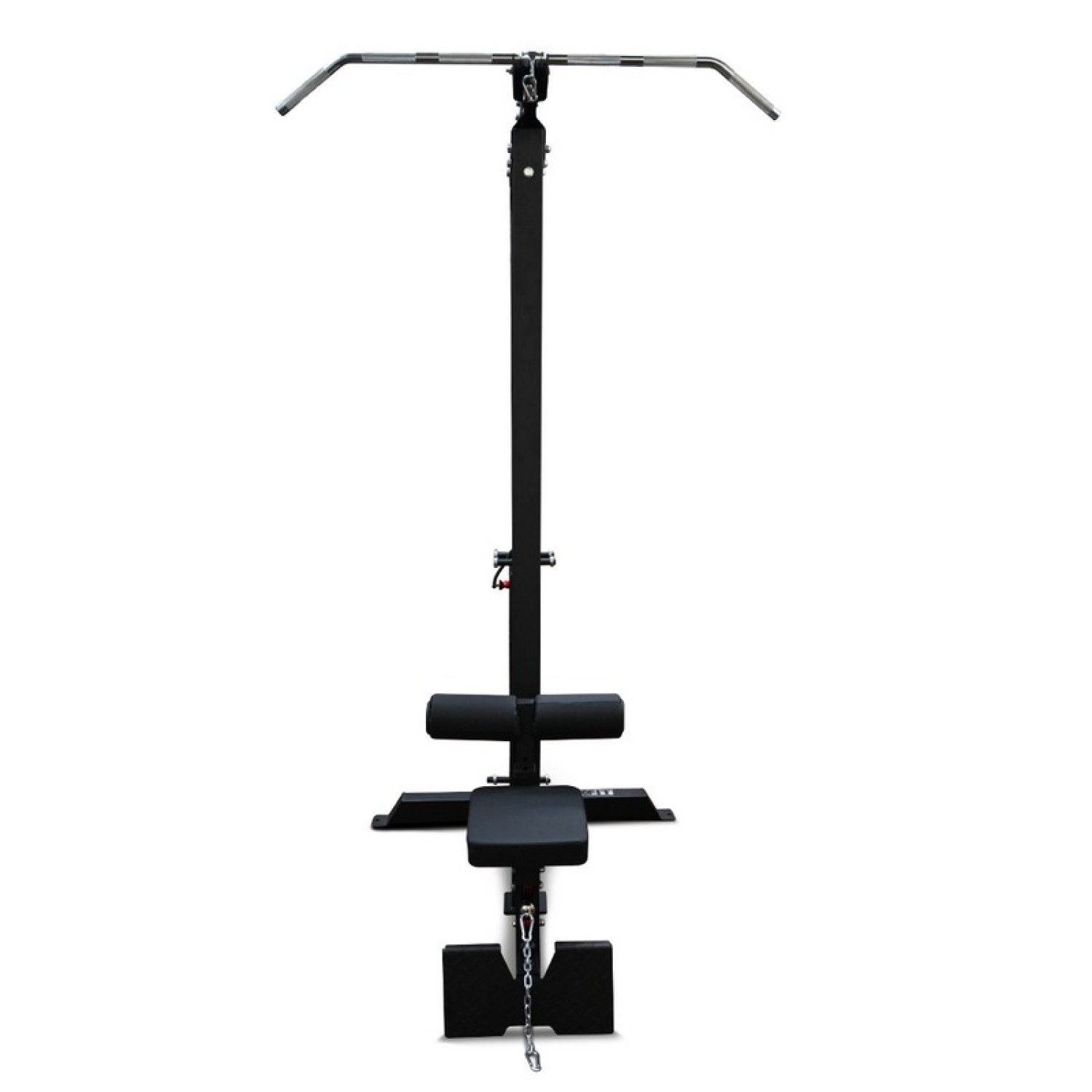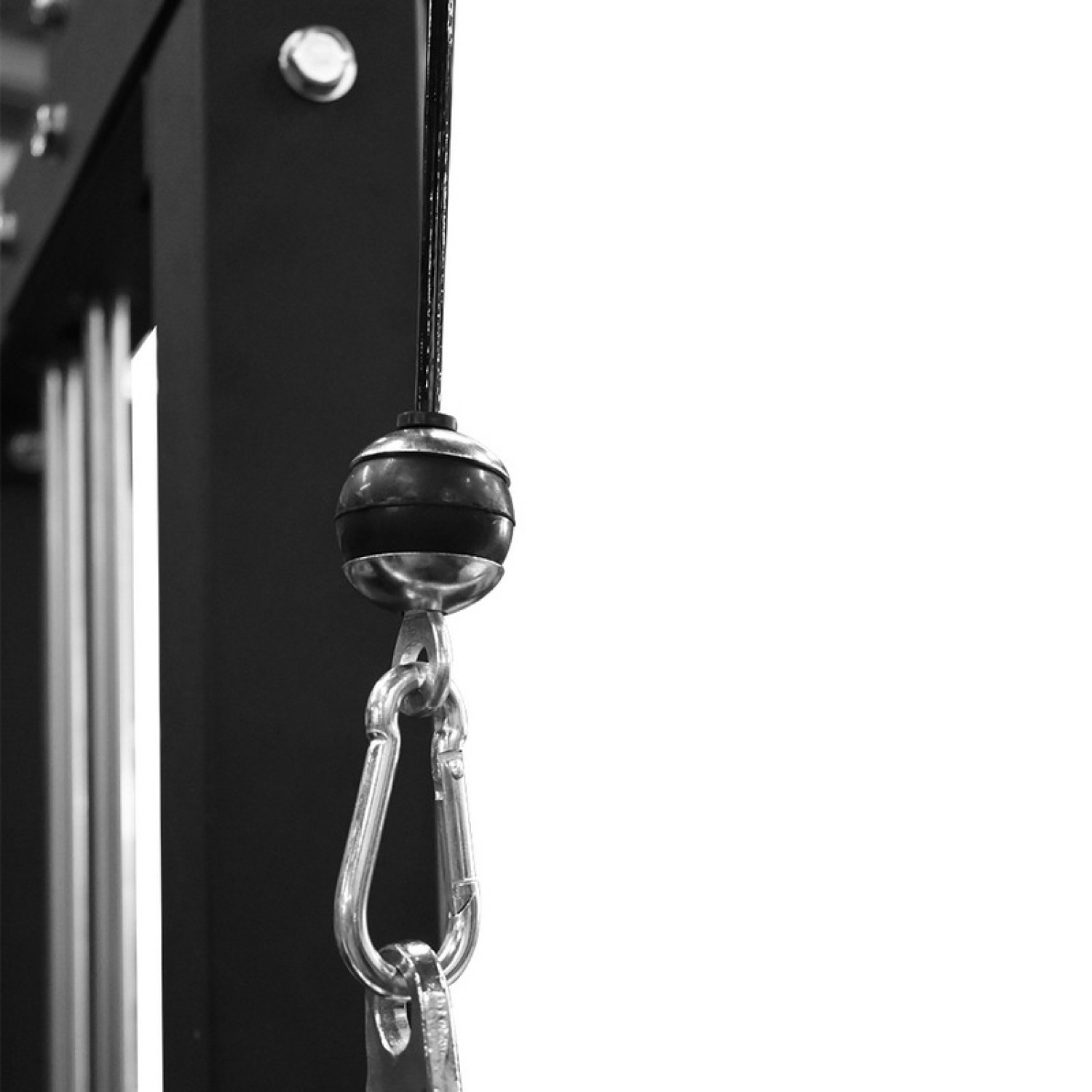 Рукоятка для верхней тяги выполнена из долговечной хромированной стали с накаткой для широкого и узкого хвата. Крепления для рукояток верхней и нижней тяги снабжены надежными хромированными карабинами для быстрой смены блочной ручки. На концах карабинов расположены отбойные резиновые шарики с алюминиевыми шайбами, которые предотвращают повреждения рукоятки и рамы, а также амортизируют удар при резком отпускании ручки.