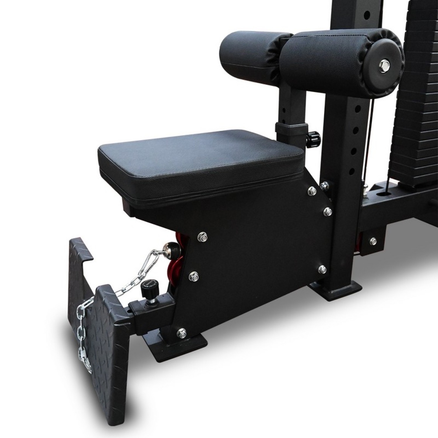 Оснащен простой регулировкой высоты сиденья и горизонтального уровня платформы для ног с помощью пружинного фиксатора с винтовой затяжкой (4 позиции для обеих регулировок). Это позволяют настроить тренажер под спортсмена любого роста и комплекции. Прочная рама из квадратного стального профиля 75х75 мм и толщиной стенки 3 мм способна выдержать максимальную нагрузку до 300 кг. Стальные части покрыты двумя слоями порошковой краски, защищая тренажер от коррозии и повреждений.