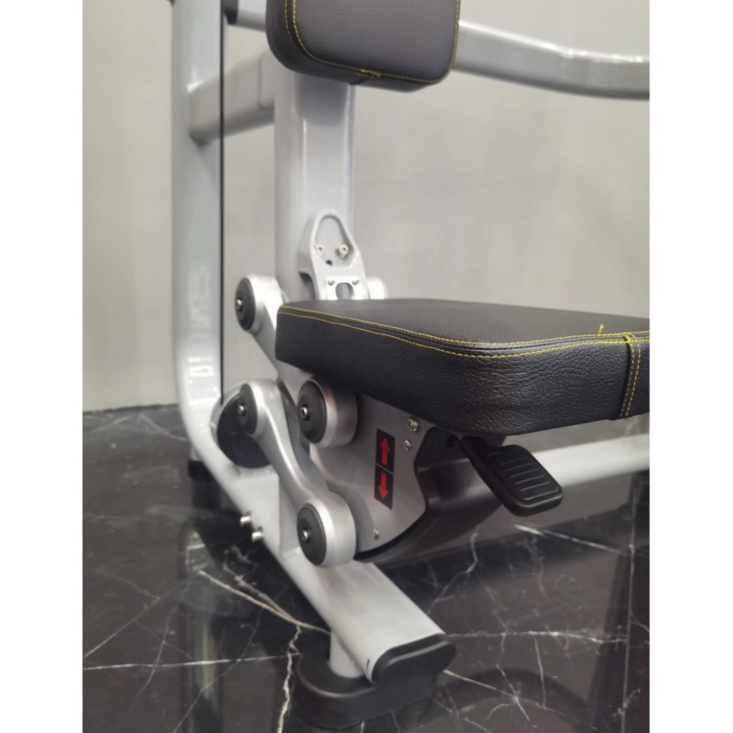 Сиденье тренажера регулируется под разный рост пользователя в 5 позициях. Механизм регулировки изготовлен по схеме параллелограмма из алюминиевого сплава, плавность регулировки обеспечена торсионной пружиной, что удобно и безопасно. Контурное эргономичное сиденье из прочной премиальной ПУ кожи профессионального класса ("автомобильная линейка") с наполнителем из цельного ППУ уменьшает давление на поясничный отдел и позволяет занять удобное положение во время тренировки.