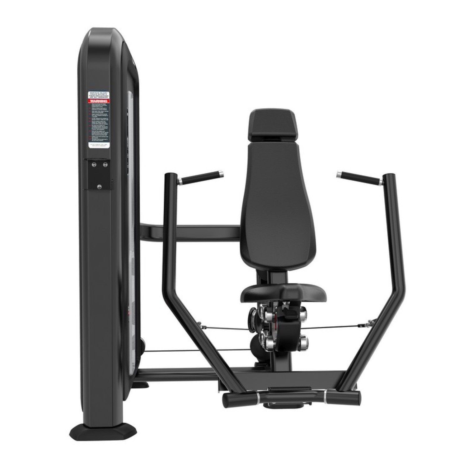 Безопасность тренировки на тренажере жим от груди для обеспечена пластиковыми кожухами шкивов и двухсторонним защитным кожухом стековой части из экологически чистого акрила и ABS-пластика. Тросовый блок тренажера снабжен долговечными алюминиевыми шкивами с впресованными малошумными подшипниками, стальным 5 мм тросом с ПУ покрытием, идеально ровными стальным направляющим стеков с зеркальной полировкой и втулкам грузов стека с низким коэффициентом трения.