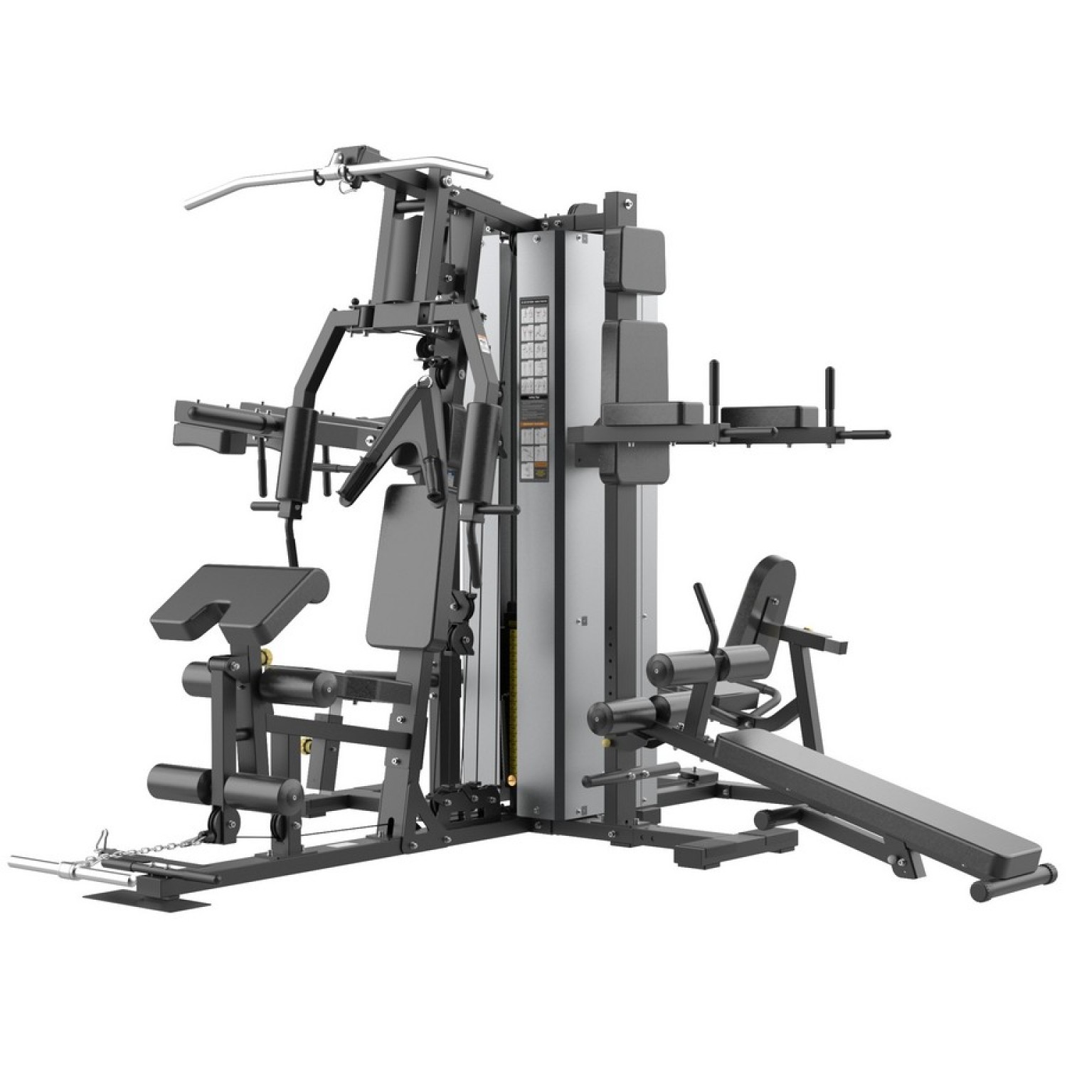 Мультистанция 4-х позиционная Gymmaster HG5004 относится к тренажерам высокого класса для полупрофессионального использования. На тренажере 4 рабочих зоны и максимально возможное количество упражнений на каждой станции, здесь есть всё - жим от груди, баттерфляй, тяга сверху, тяга снизу, бицепс, трицепс стоя, скамья для пресса, пресс-брусья, разгибание рук из-за спины, присед на свободном весе, жим ногами, разгибание ног и др.