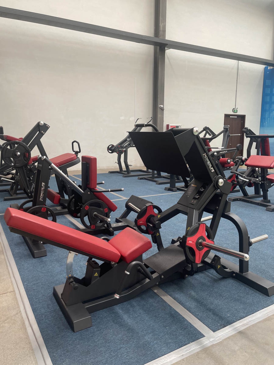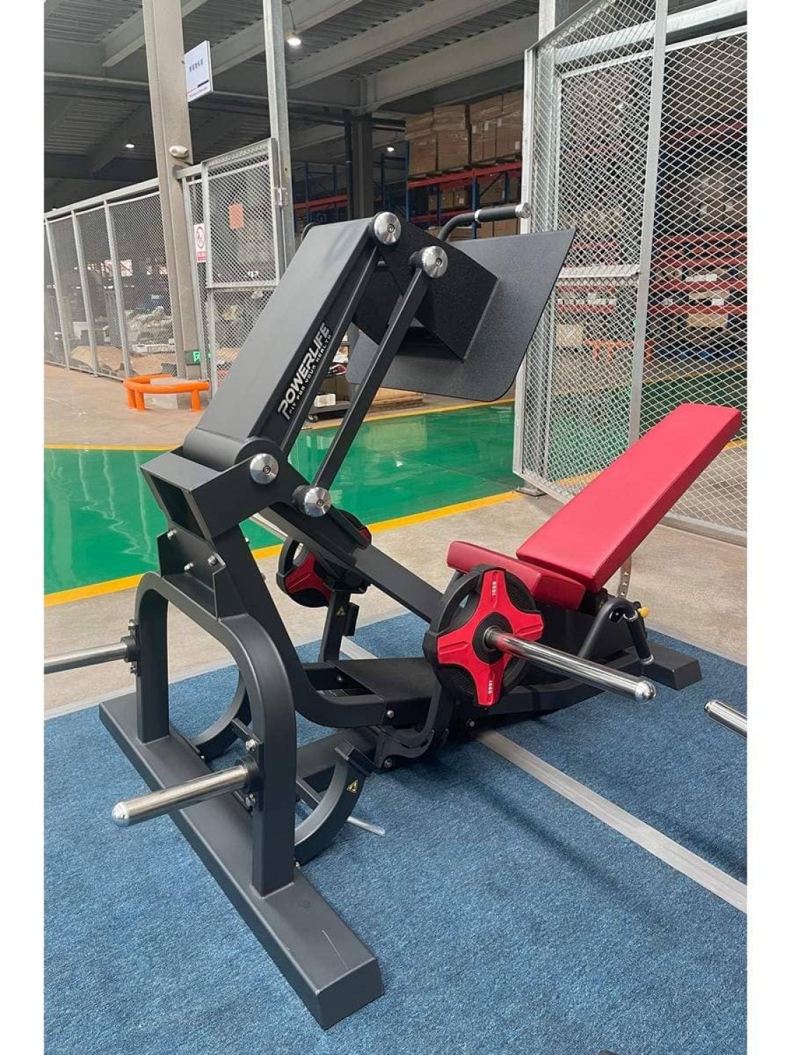 Платформа тренажера покрыта слоем нескользящего абразива и хорошо фиксирует ноги во время тренировки. Длинные втулки для нагружения позволяют навесить на тренажер до 500 кг блинов. Для удобства спортсменов на задней части рамы расположены адаптеры для хранения дисков. Небольшой наклон втулок вверх предотвращает сваливание весов, резиновые кольца защищают раму от повреждений, быстрое надевание дисков обеспечено полусферическими торцами из алюминиевого сплава.