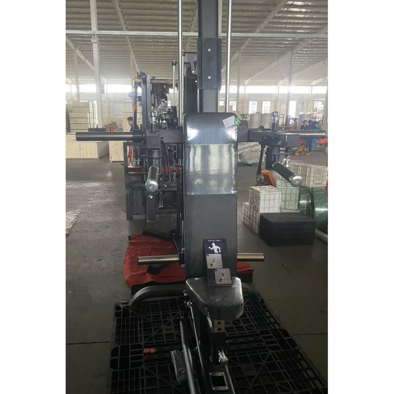 Станок нагружается олимпийскими дисками с посадочным диаметром 50 мм, две втулки длиной 40 см способны выдержать максимальную нагрузку до 300 кг. Плавное движение рычага тренажера достигается за счет полированных направляющих (30 мм, сталь) и прочных линейных подшипников. Компактность конструкции достигается за счет того, что направляющие находятся над рычагами.