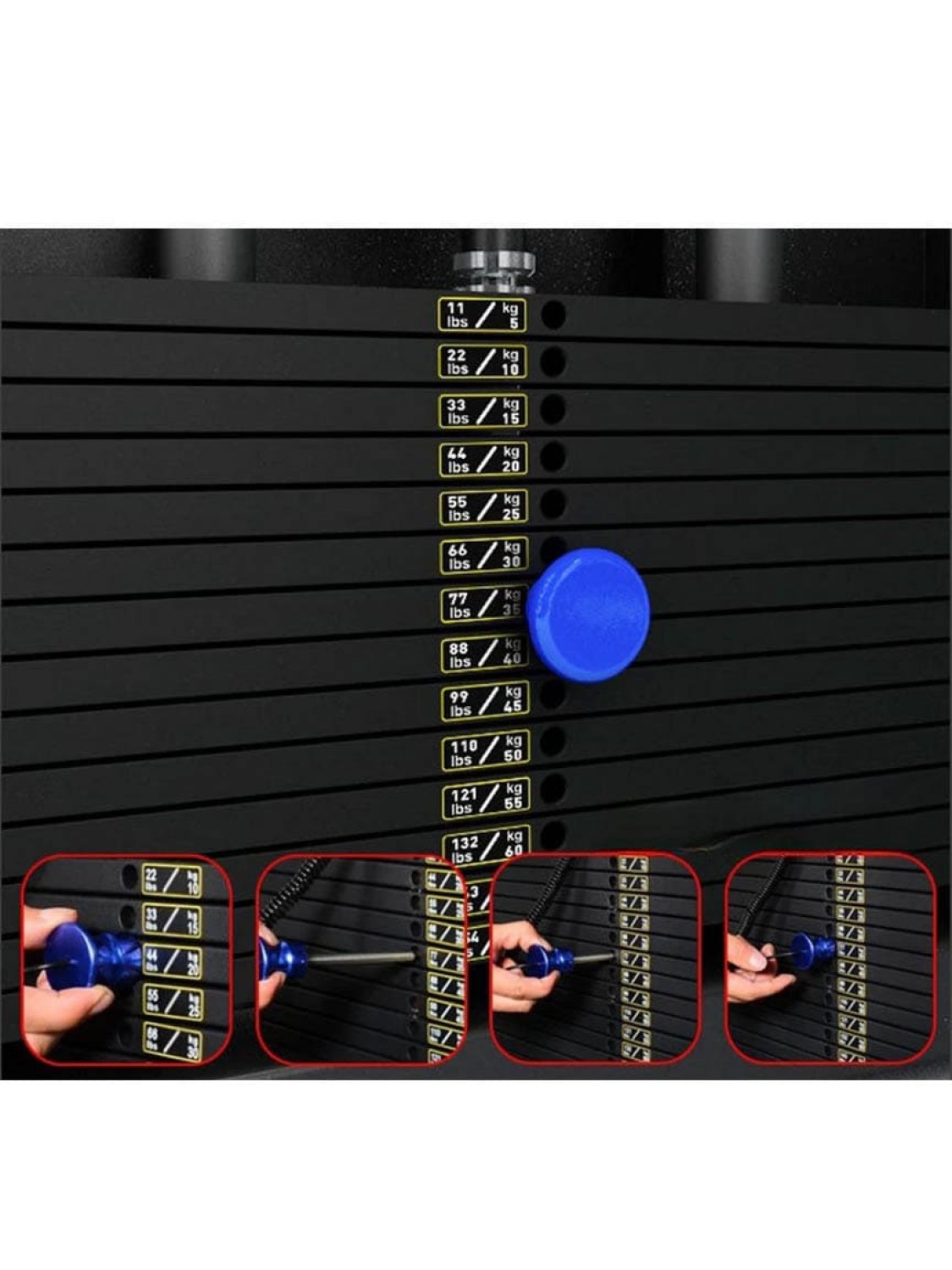 Нагрузка изменяется в диапазоне от 7 до 100,6 кг с шагом 7 кг. Для уменьшения шага предусмотрены два груза по 2,3 кг, которые можно опустить в любой момент на верхнюю плитку стека и изменить общий вес на 2,3 или 4,6 кг. Это позволяет постепенно наращивать сложность тренировок.
