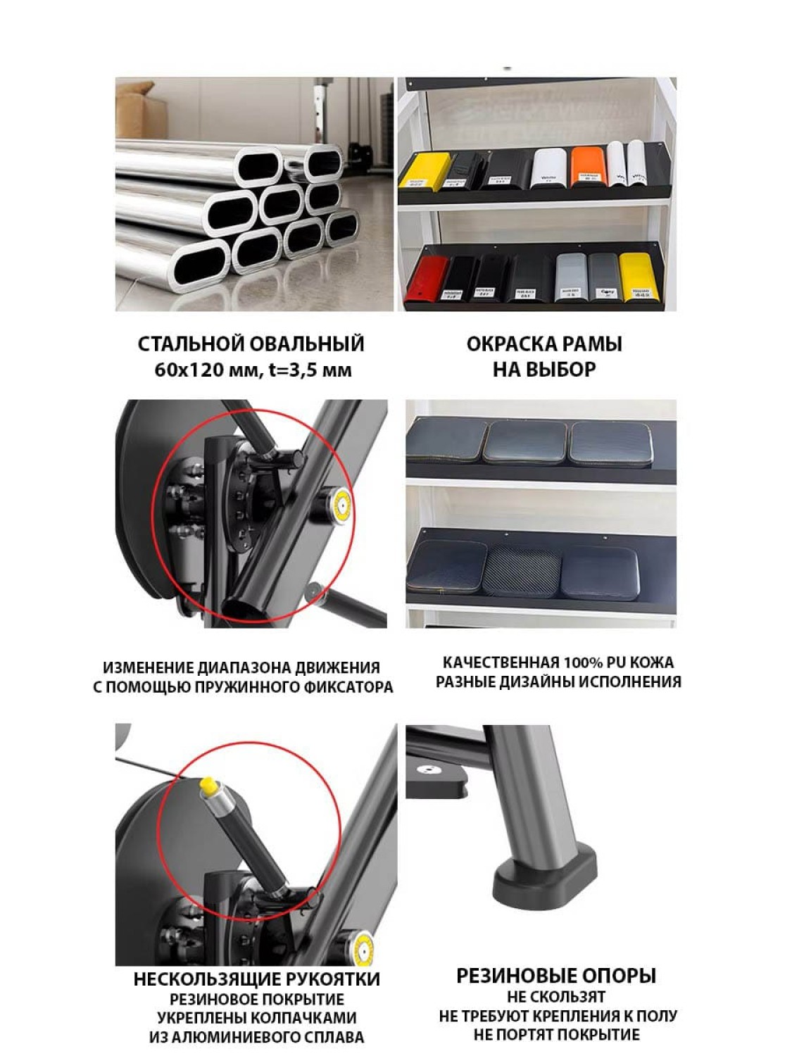 Сиденье и спинка тренажера имеют контурную форму и биомеханический угол наклона для правильной изоляции целевых мышц. Все подушки выполнены из премиальной толстой 100% PU кожи профессионального класса (автомобильная линейка) с наполнителем из цельного ППУ, уменьшают давление на позвоночник и поясничный отдел и позволяет занять удобное положение во время тренировки.