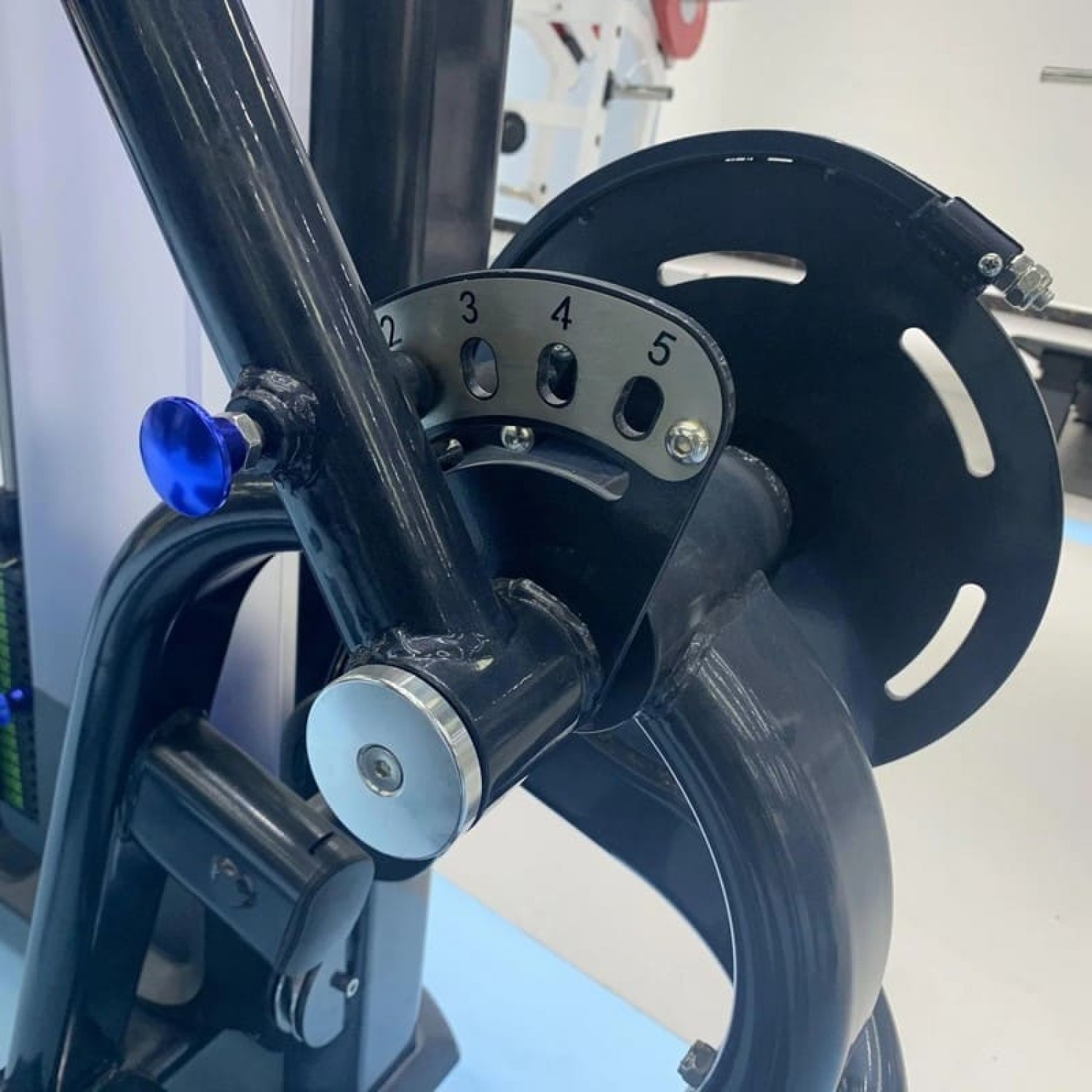 Амплитуда движения регулируется в 5 положениях для настройки тренажера под рост пользователя и переноса акцента на разные группы мышц-разгибателей. Смена положения выполняется с помощью пружинного фиксатора со стальным сердечником и яркой алюминиевой рукояткой, достаточно оттянуть ручку и сменить положение роликового валика. Позиции пронумерованы методом лазерной гравировки, что помогает быстро занять необходимую позицию при повторном использовании тренажера.