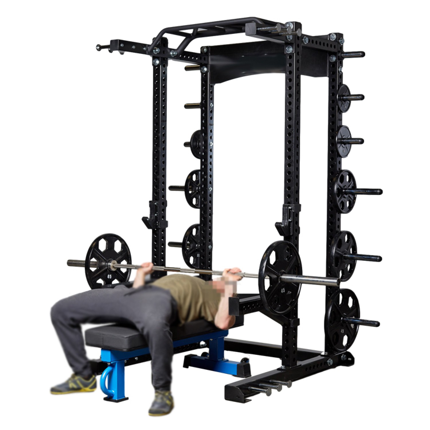 Массивность и устойчивость раме придают 12 хромированных держателей для хранения дисков с резиновыми амортизаторами, защищающими раму и диски от повреждений. Данный силовой тренажер подходит для тяжелоатлетов, пауэрлифтеров и тренировок по кроссфиту. По 3 крепления с каждой стороны снизу и по 3 снизу рамы позволяют закрепить эспандер для постепенного увеличения нагрузки в жиме лежа и других упражнениях.