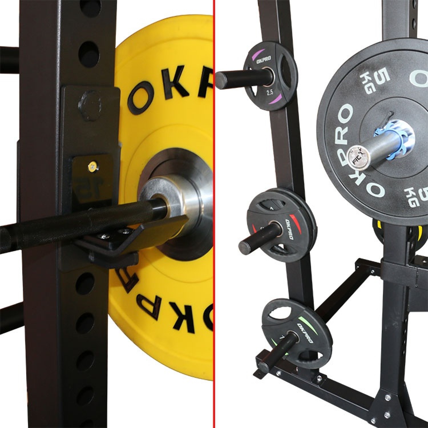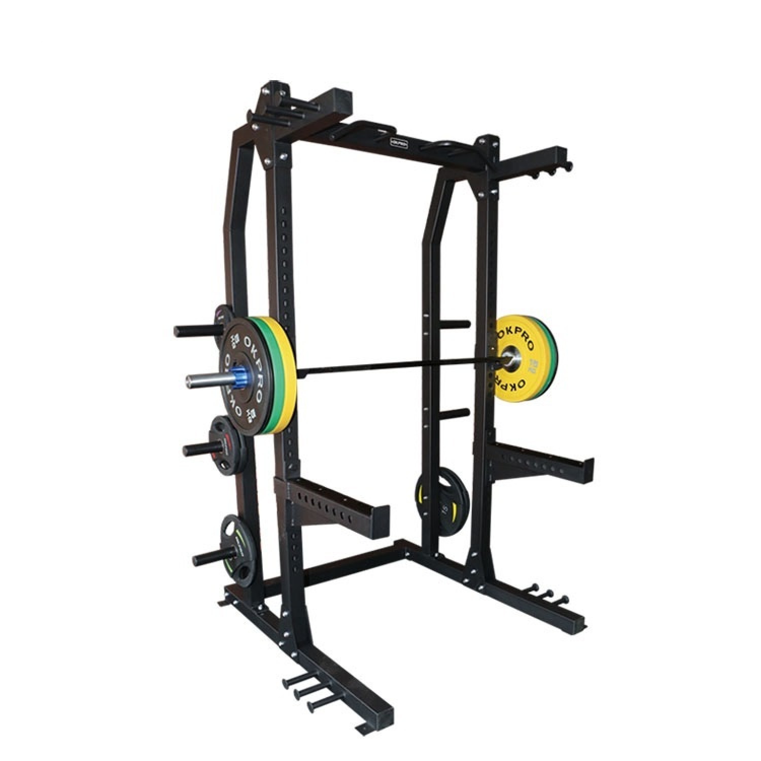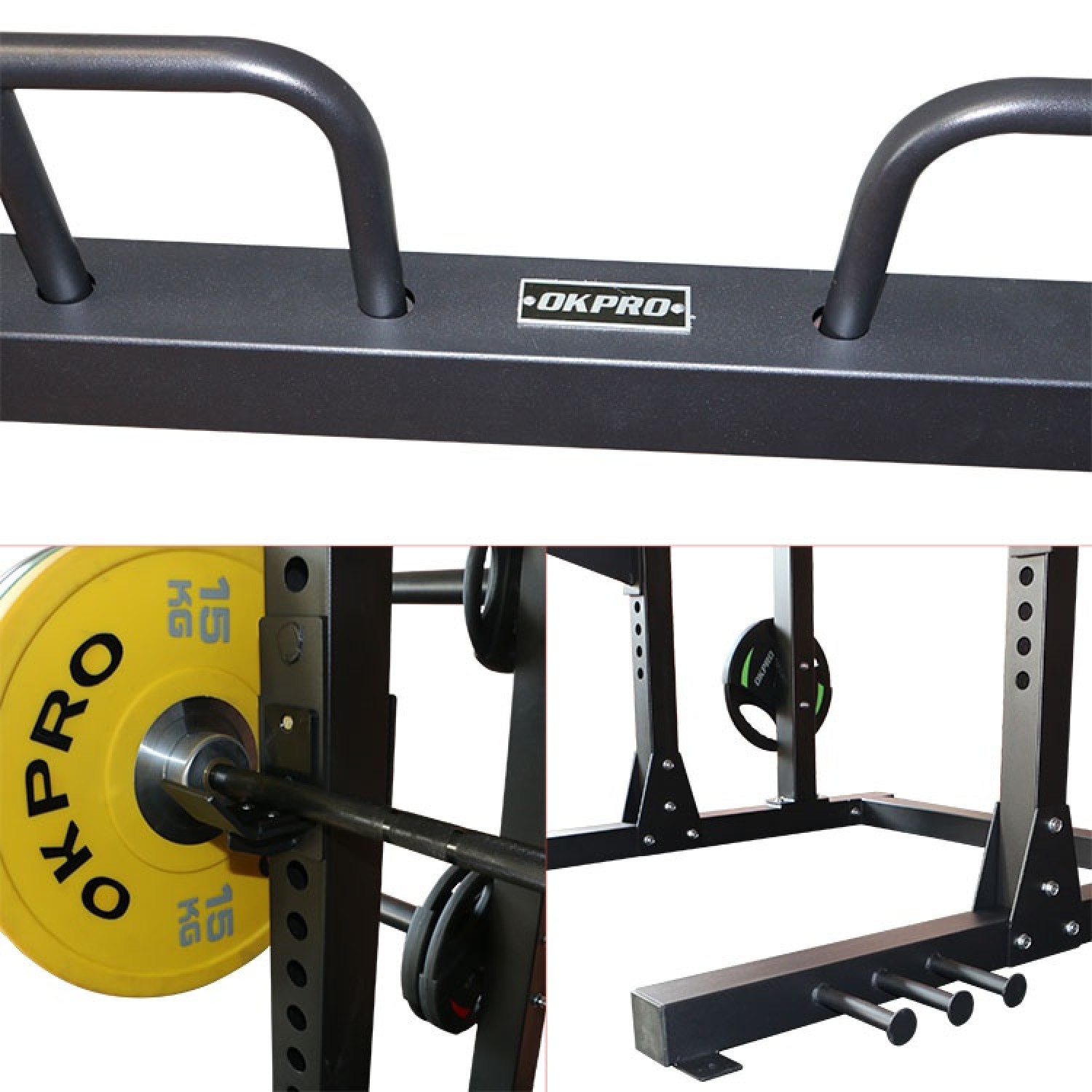 Силовая рама OKPRO OK9184E - это отличный тренажер для коммерческого или домашнего использования. Рама снабжена парой j-крюков для штанги, шестью держателями для дисков, парой надежных упоров для приседаний со штангой, турником с разными хватами и креплениями для функциональных петель.