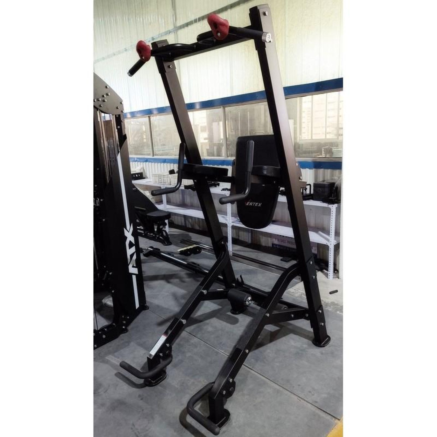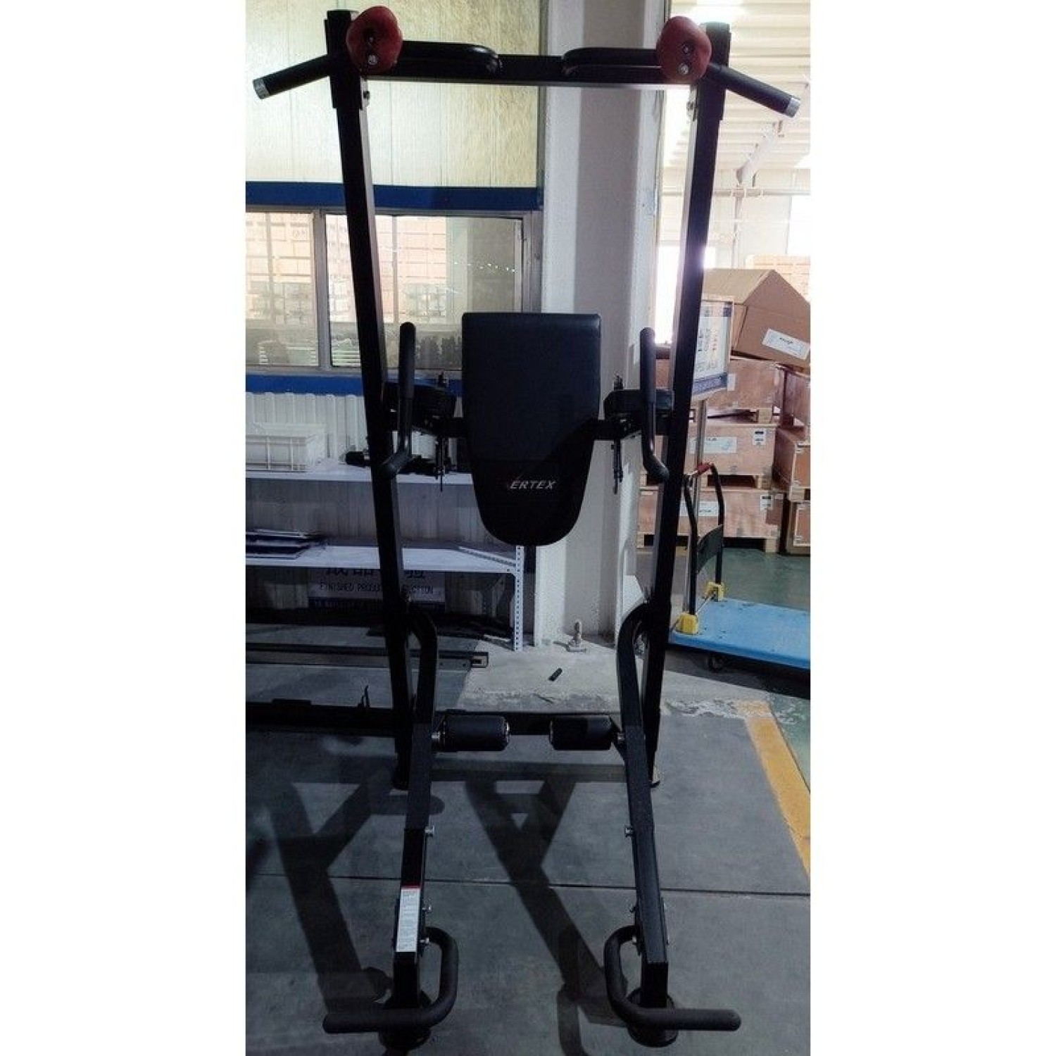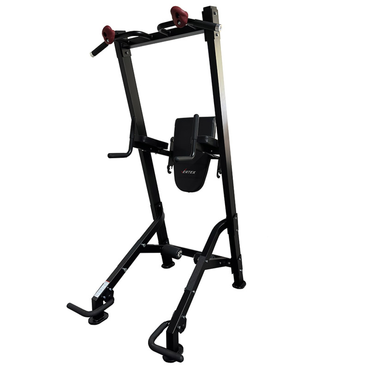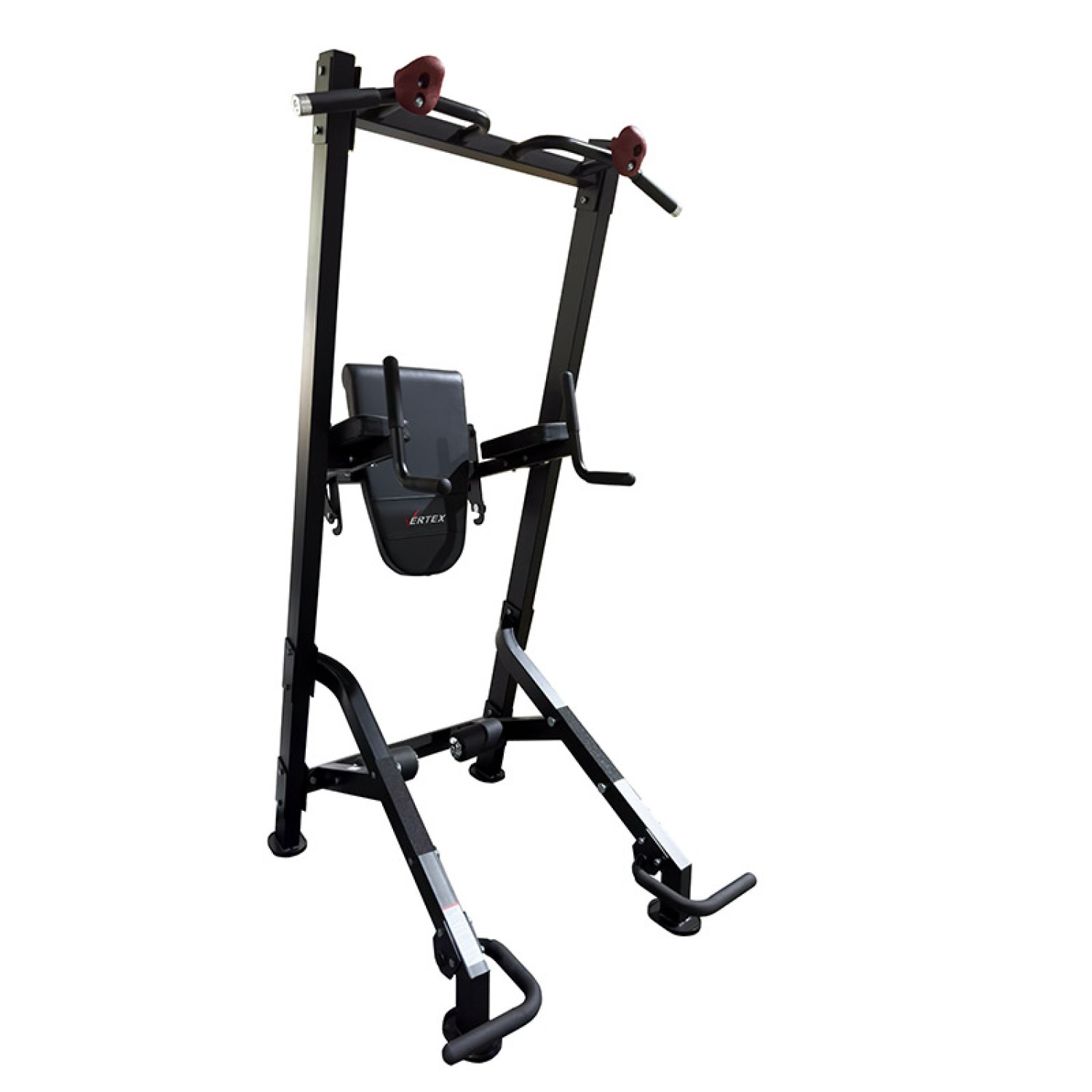 Турник-пресс-брусья Vertex FT-505 - тренажер для работы с собственным весом: подтягивания разными хватами (включая специальные захваты для скалолазания), отжимания на брусьях, подъем ног на пресс, подъем тела на скамье для пресса, отжимания. Силовая стойка снабжена брусьями с рукоятками для двух видов упражнений, спинкой и подлокотниками для снижения давления на спину и локти спортсмена, а также двумя подножками с противоскользящим покрытием для удобного захода на тренажер.