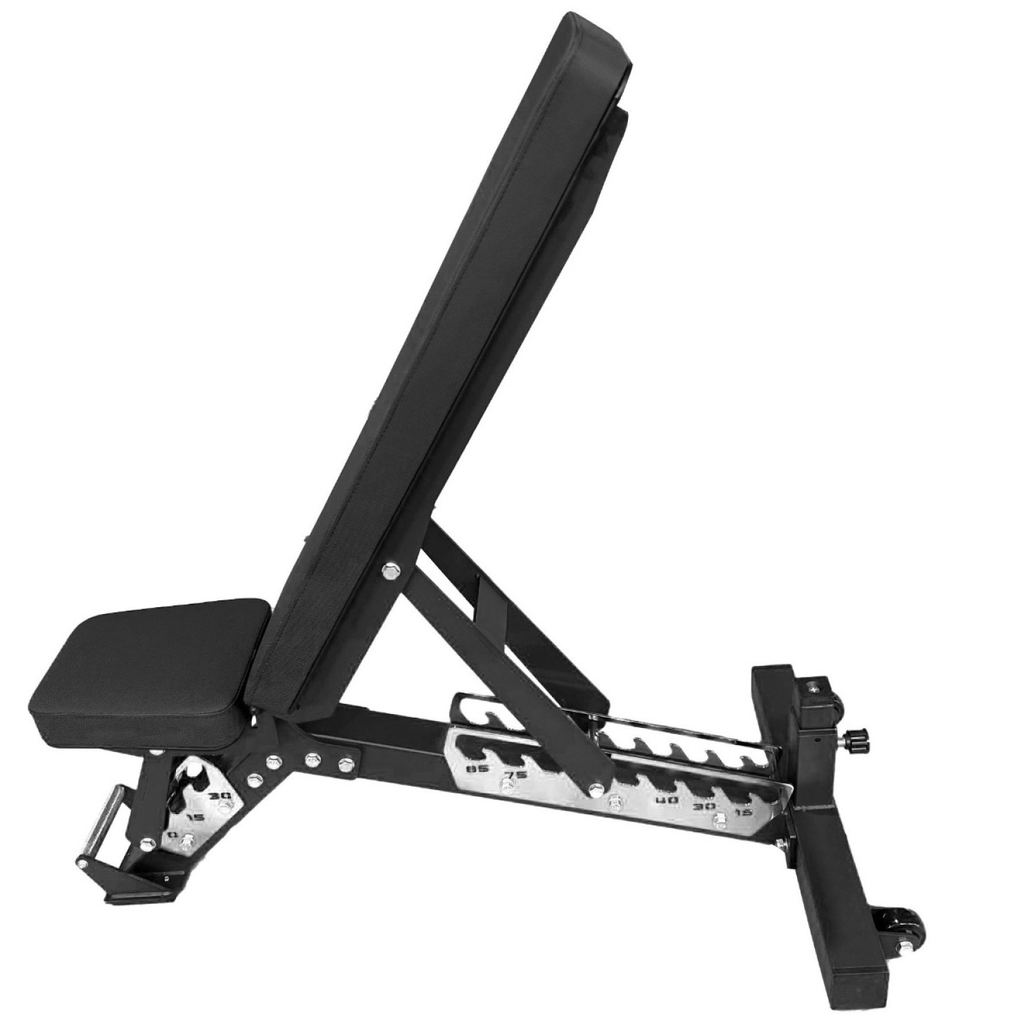 Универсальная скамья позволяет выполнять множество упражнений, благодаря изменяемому наклону спинки - от горизонтального до вертикального положения (0-85 градусов, 9 положений). Также есть два отрицательных угла наклона: -1,7 и -3,5 градуса, которые регулируются с помощью стального упора на пружинном фиксаторе. Сиденье регулируется в 3-х положениях - 0, 15 и 30 гр. Спинка имеет быстрый механизм смены положения - достаточно потянуть вверх за подушку и переставить опорную ножку на упор стальных хромированных гребенок на необходимую вам высоту.