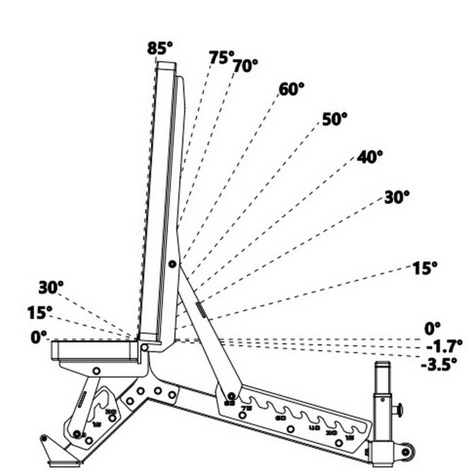 Отрицательный угол наклона спинки: -1,7 и -3,5 гр, регулируется с помощью упора на заднем стабилизаторе скамьи с помощью пружинного фиксатора.