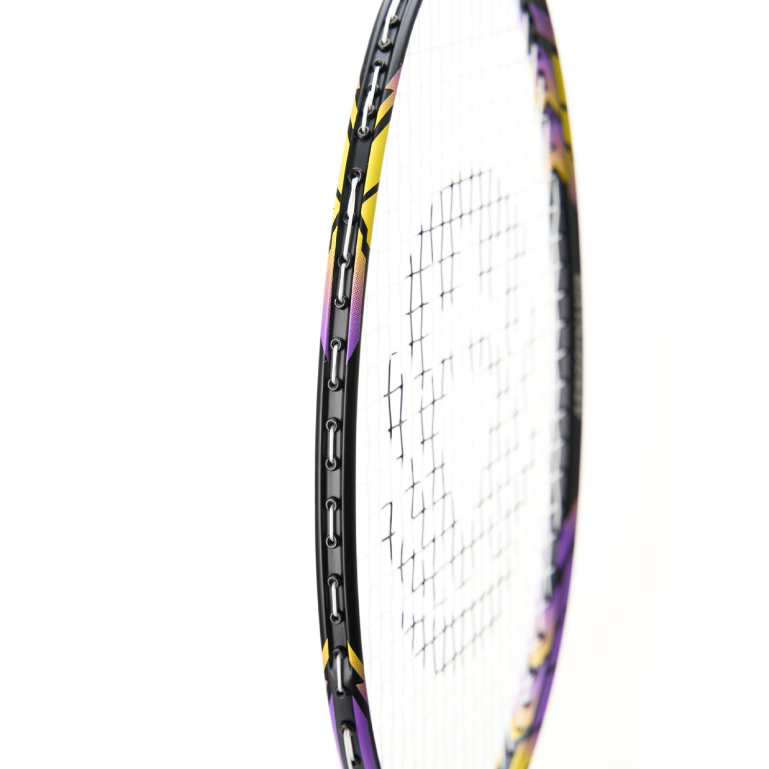 Чрезвычайная легкость этой ракетки определяется литой конструкцией из карбона, который сохраняет при этом общую среднюю жесткость конструкции, что придает дополнительную мощь ударам. Изометрическая форма головы ракетки выравнивает длину продольных и поперечных струн, увеличивая тем самым игровую площадь струнной поверхности ракетки. Универсальный баланс.