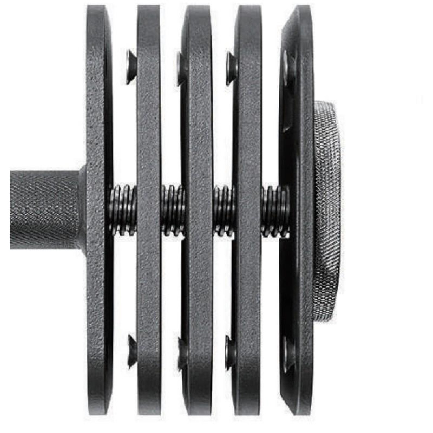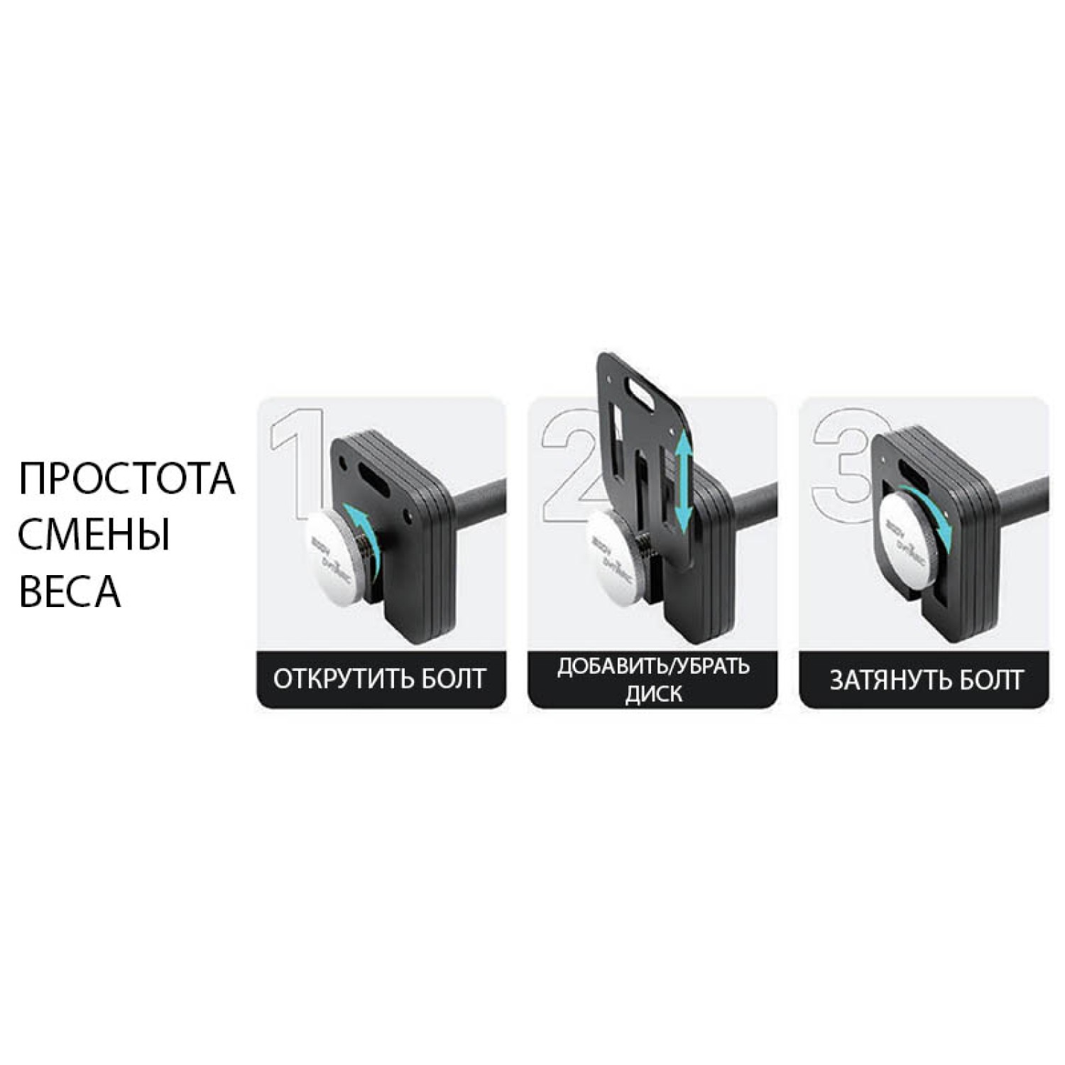 Для того, чтобы сменить вес, достаточно просто ослабить специальный винт, вынуть или вставить диск с помощью рукоятки-прорези и затянуть крепление. Смена блинов происходит быстро и безопасно, потому как нет необходимости полностью снимать крепление и надевать блин в посадочное отверстие, диск вставляется сверху.