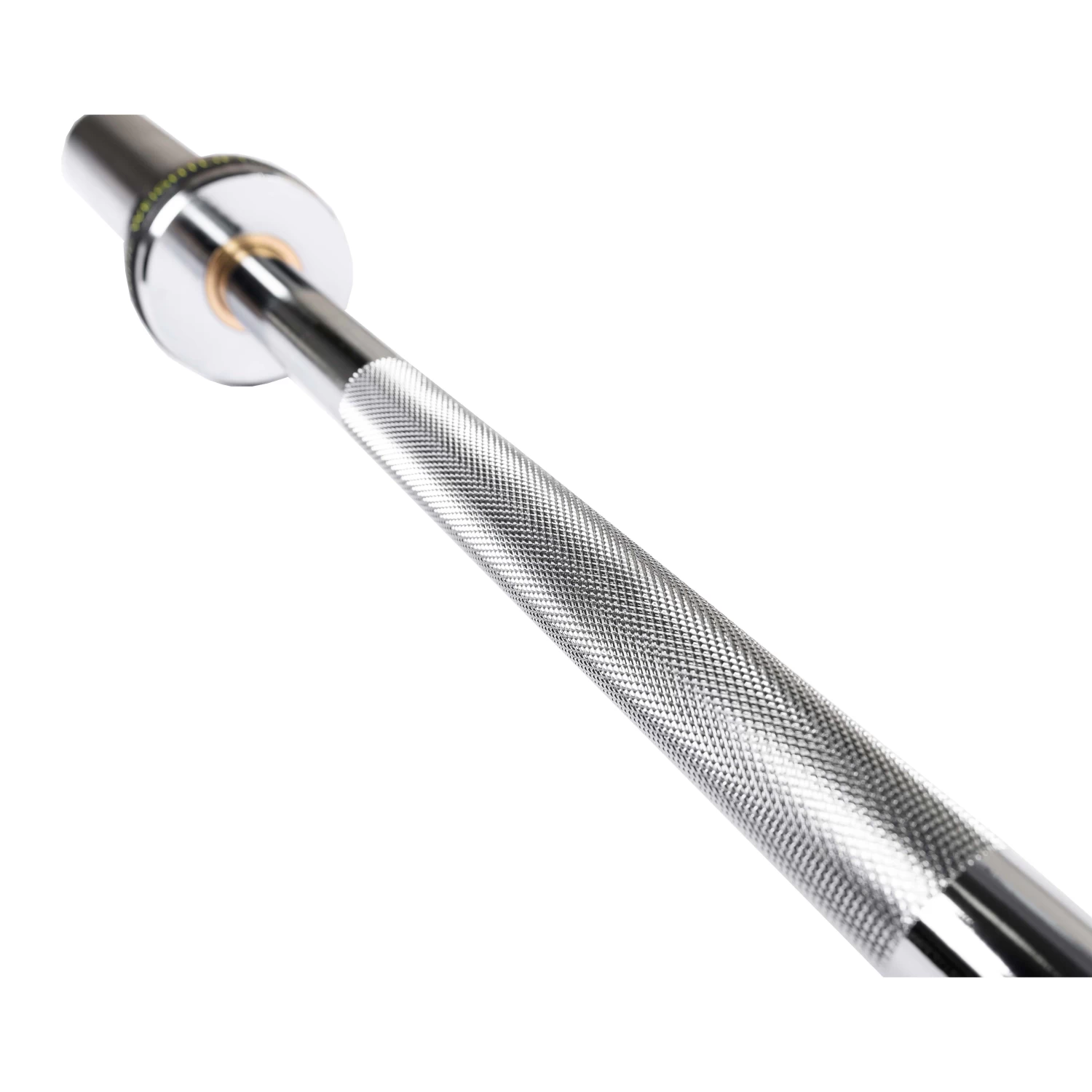 Изготовлен из конструкционной стали, покрытие - зеркальный хром, длина - 1250 мм, гладкая втулка - 50 мм, латунные кольца-вставки, замки-пружины, нагрузка до 150 кг. Вес грифа – 12,5 кг, рукоять ?– 28 мм, расстояние между втулками – 810 мм.