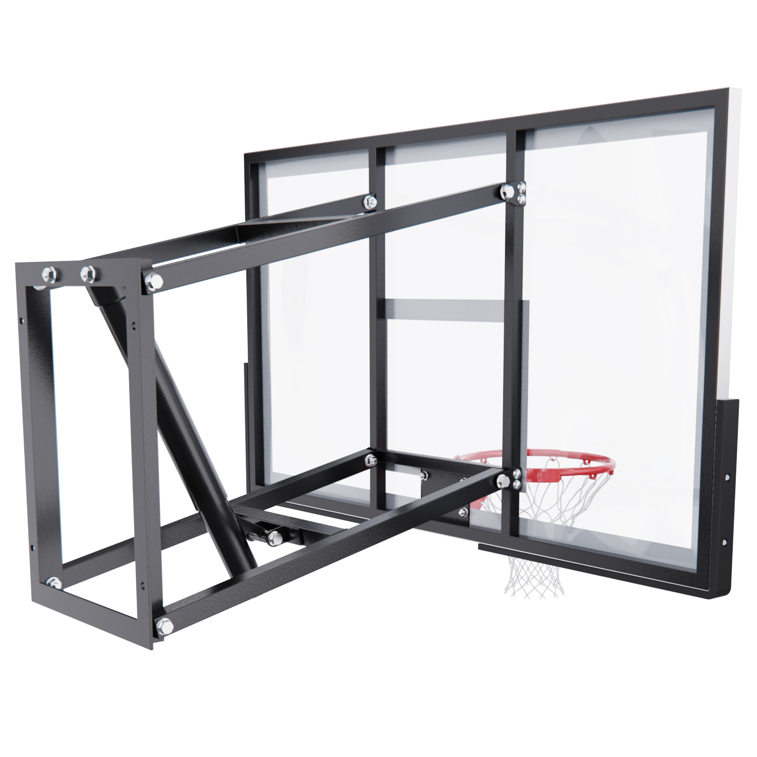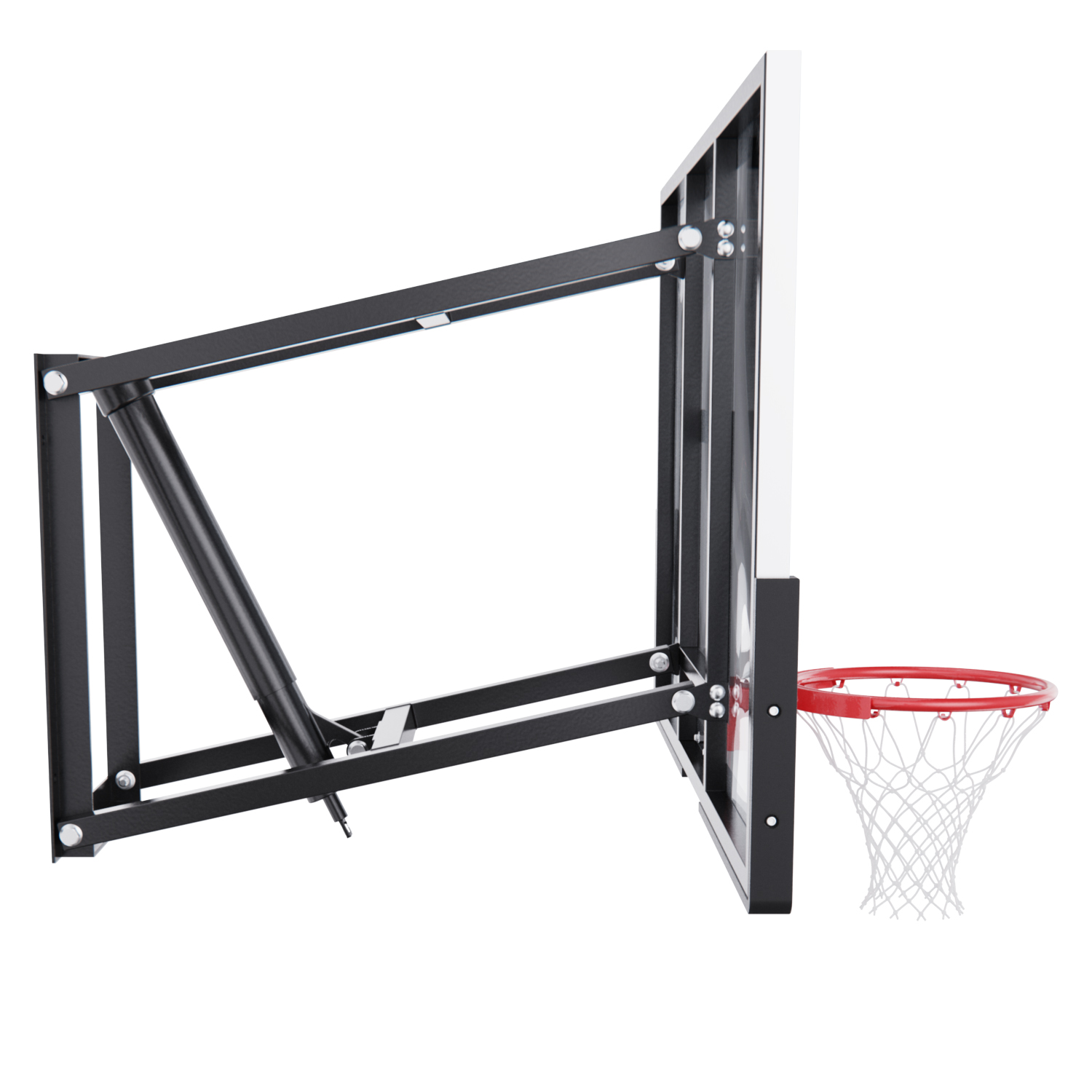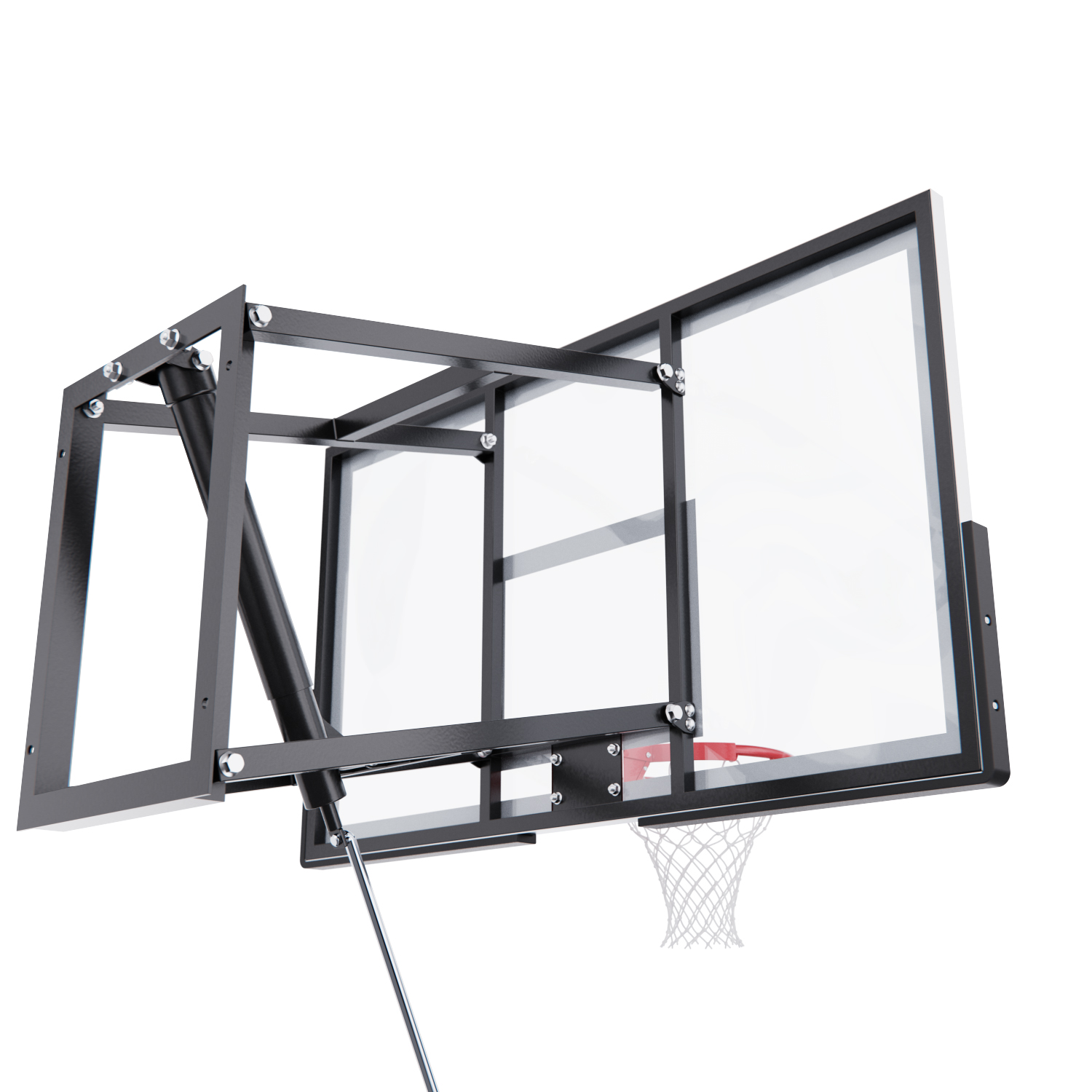 Щит изготовлен из прочного закалённого стекла толщиной 6 мм — материала, обеспечивающего отличный отскок мяча и устойчивость к ударам. Его размеры — 136 х 80 см, что делает его максимально приближенным к профессиональному оборудованию. Регулируемый вынос щита (51–55,5 см) повышает безопасность и удобство во время игры.