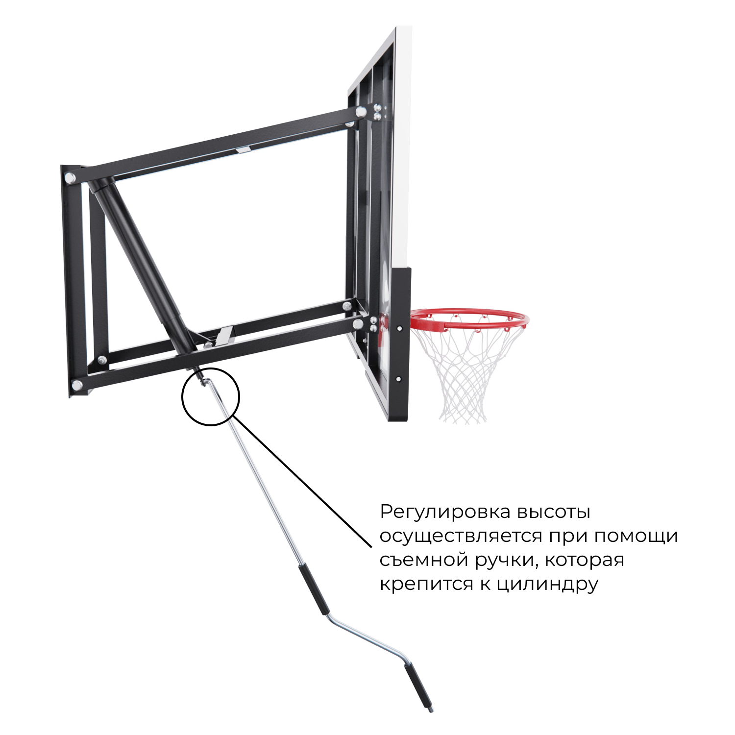 Кольцо стандартного диаметра 45 см устойчиво к интенсивной нагрузке. Высоту кольца можно регулировать от 180 до 305 см при помощи съёмной ручки, которая крепится к цилиндру, благодаря чему можно адаптировать баскетбольный щит под любой уровень подготовки и возраст игроков. Это особенно удобно при тренировках с детьми или в семейных играх. В целях безопасности запрещается висеть на кольце и других элементах баскетбольного щита.