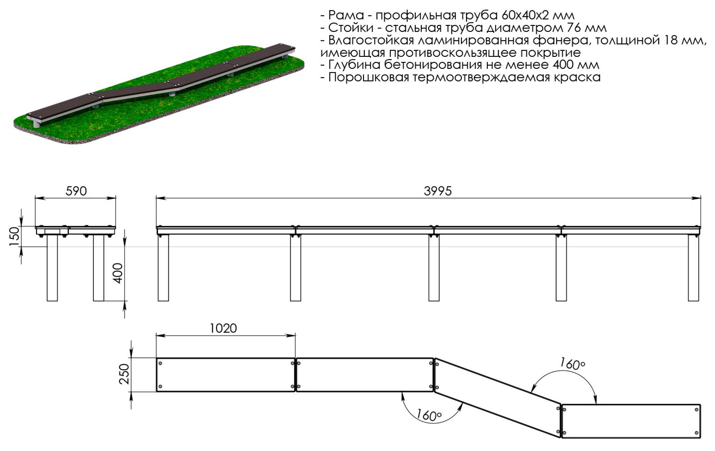 - Стойки из стальной трубы диаметром 76мм, бетонируются на глубину 400мм;