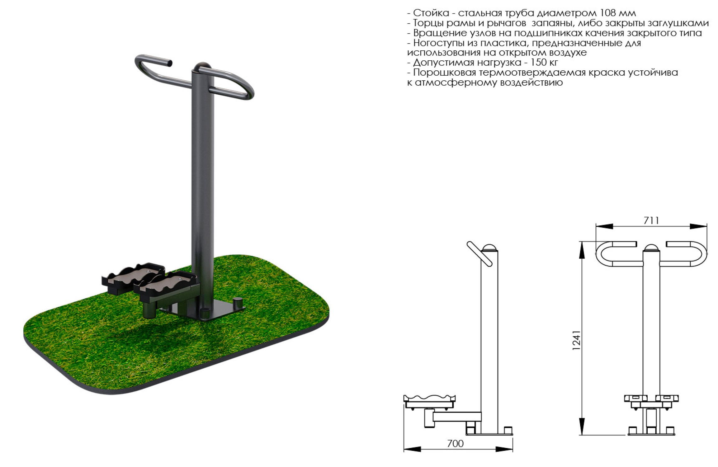 - Стальная рама из трубы диаметром 108мм, имеет сферическую пластиковую заглушку;